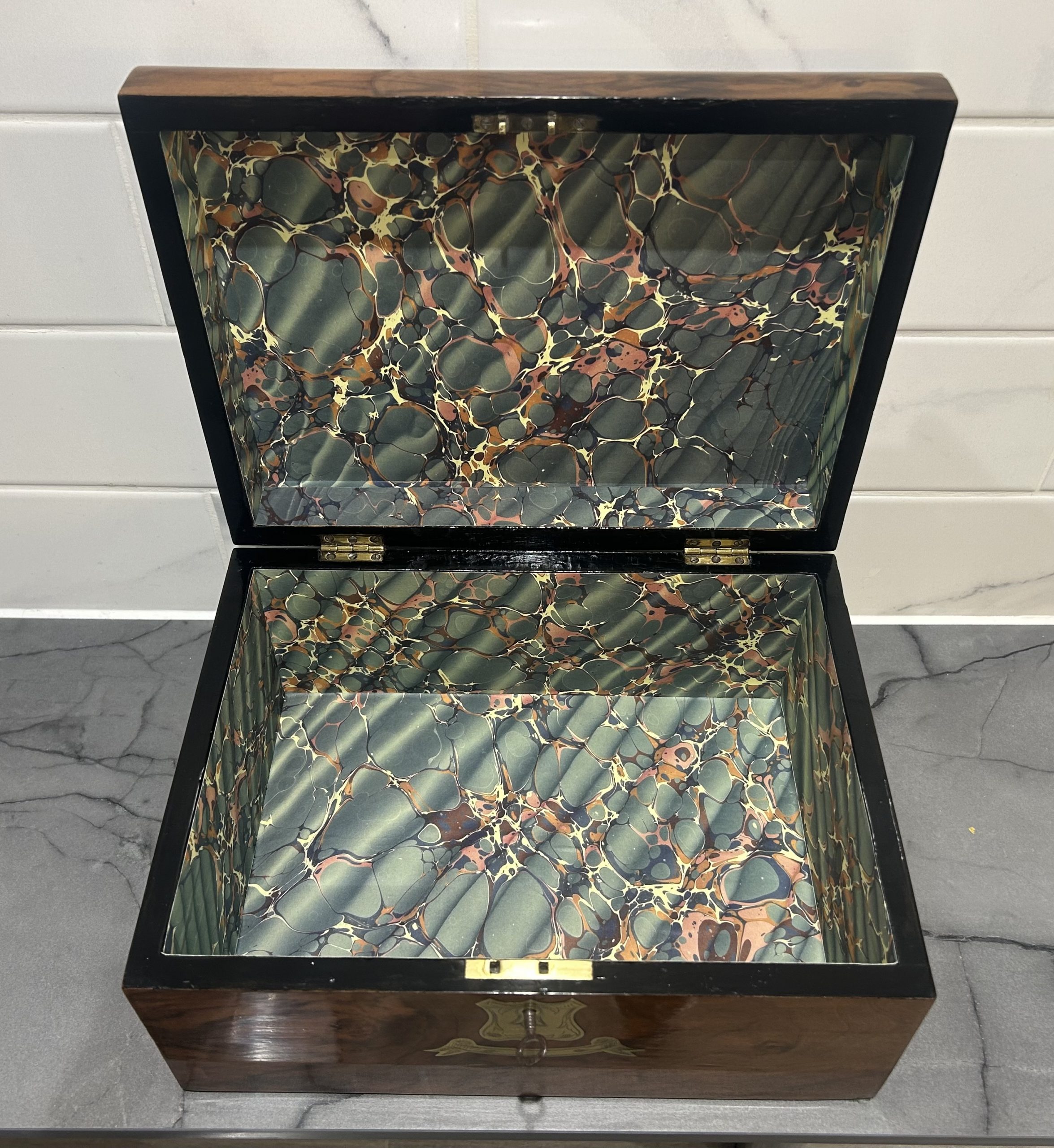 We have professionally relined the interior with a beautiful handcrafted marble paper.