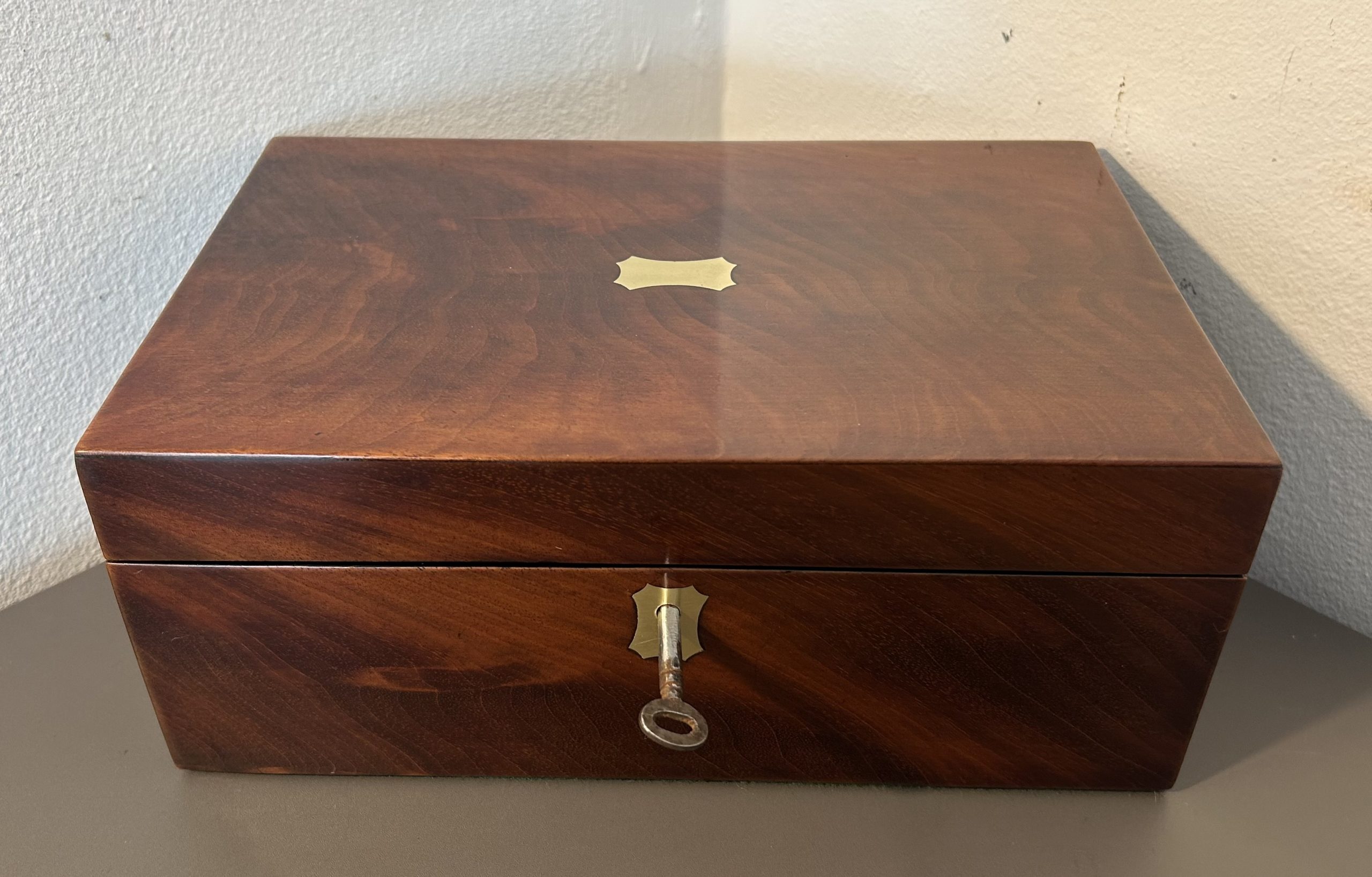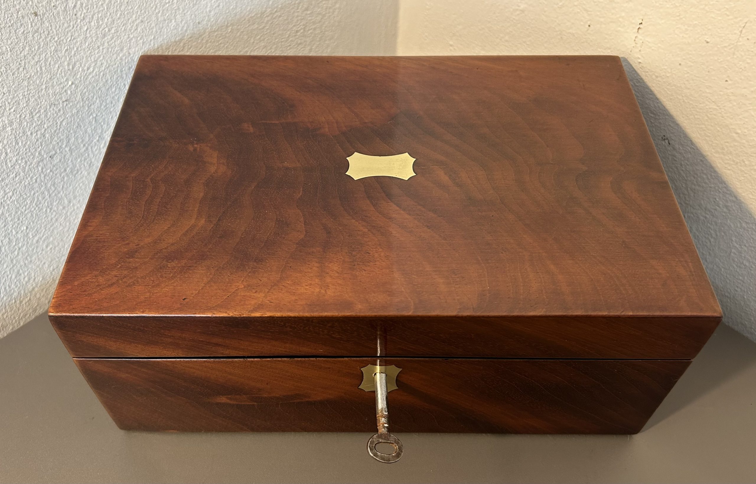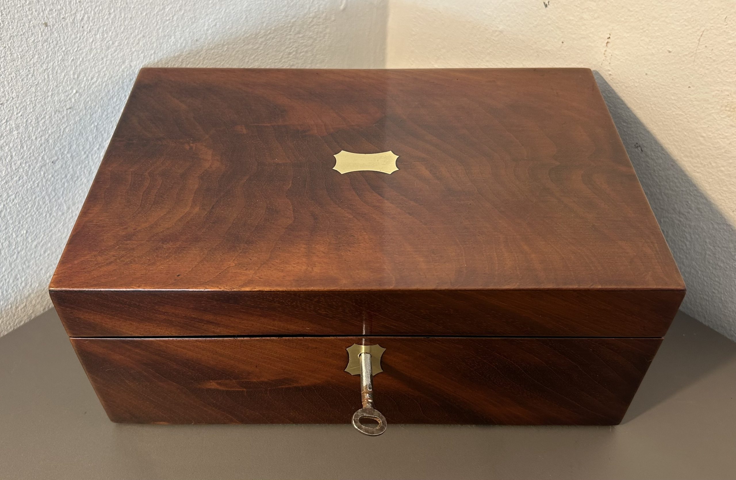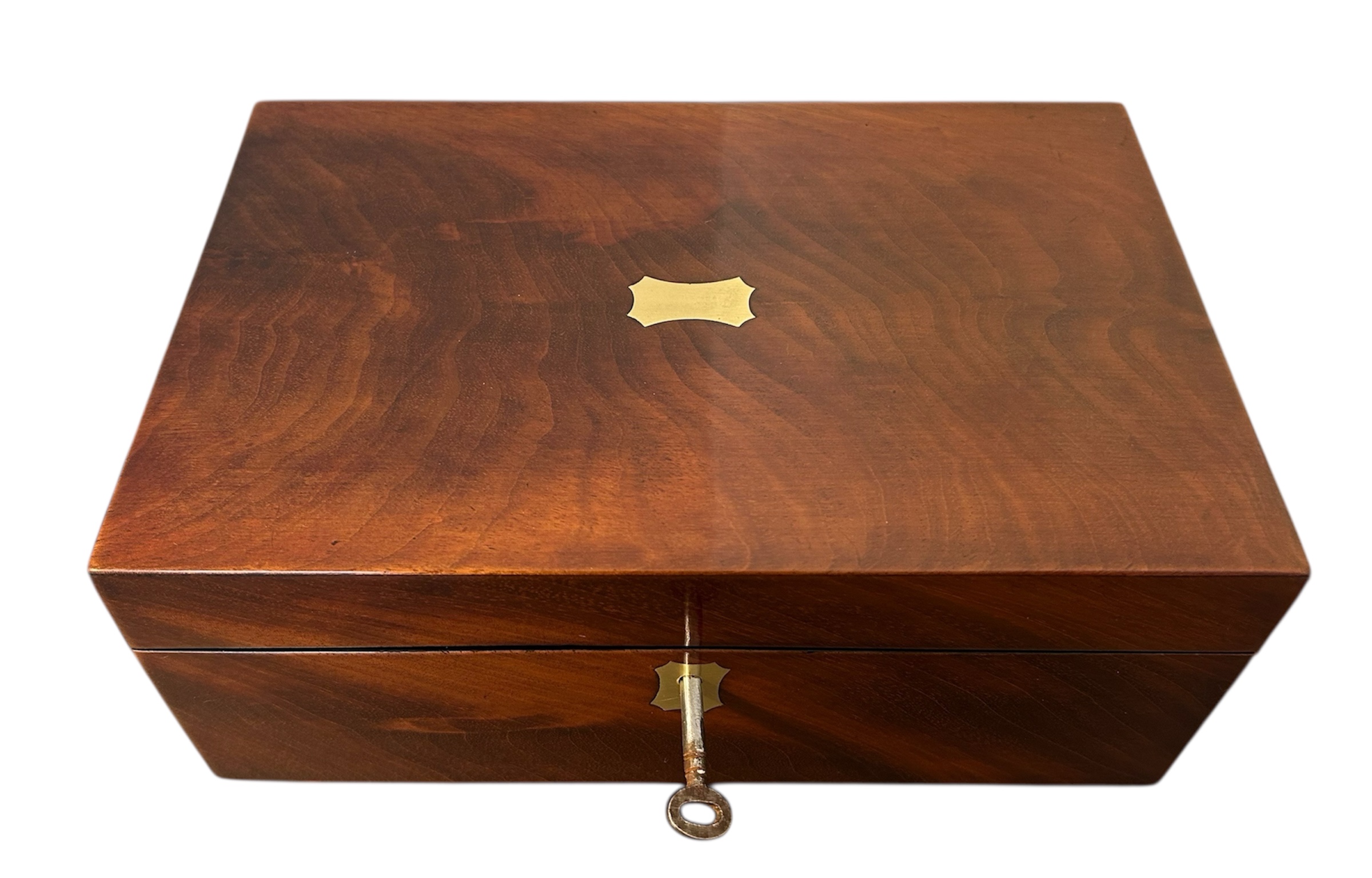 A superb example of a Victorian Flame mahogany jewellery box dating back to c.1860. The box features a brass top and key escutcheon complete with a working lock in a beautiful piece of flame mahogany.