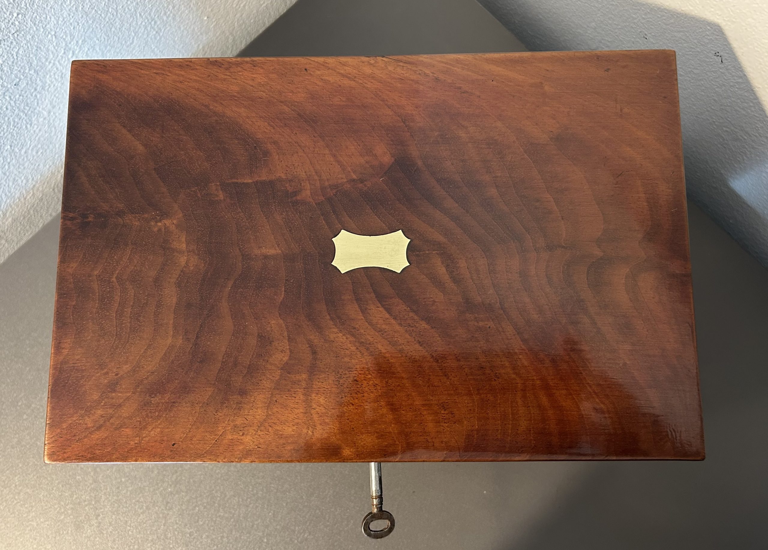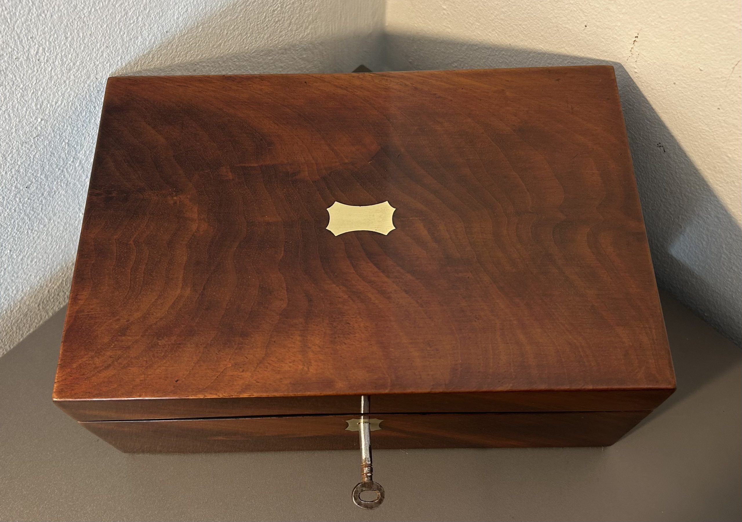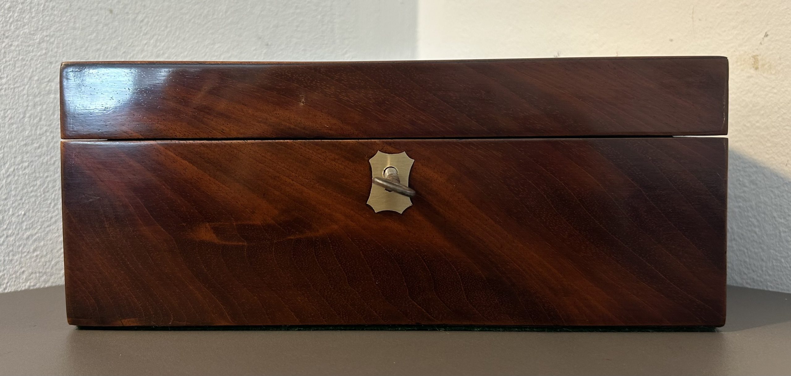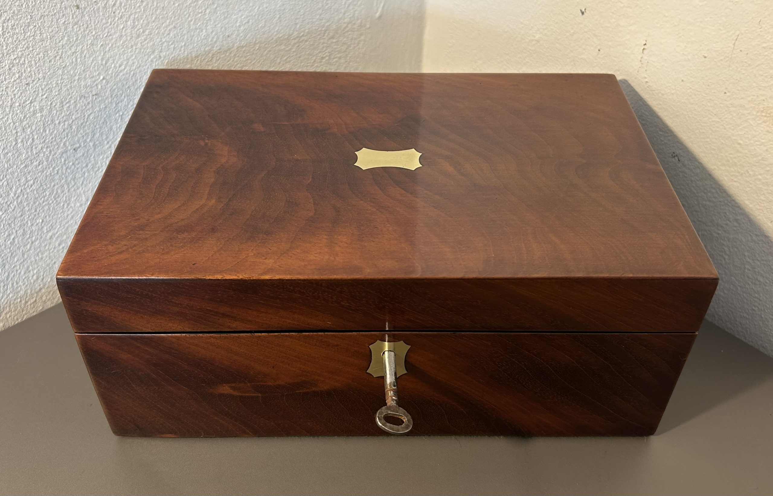 A superb example of a Victorian Flame mahogany jewellery box dating back to c.1860. The box features a brass top and key escutcheon complete with a working lock in a beautiful piece of flame mahogany.