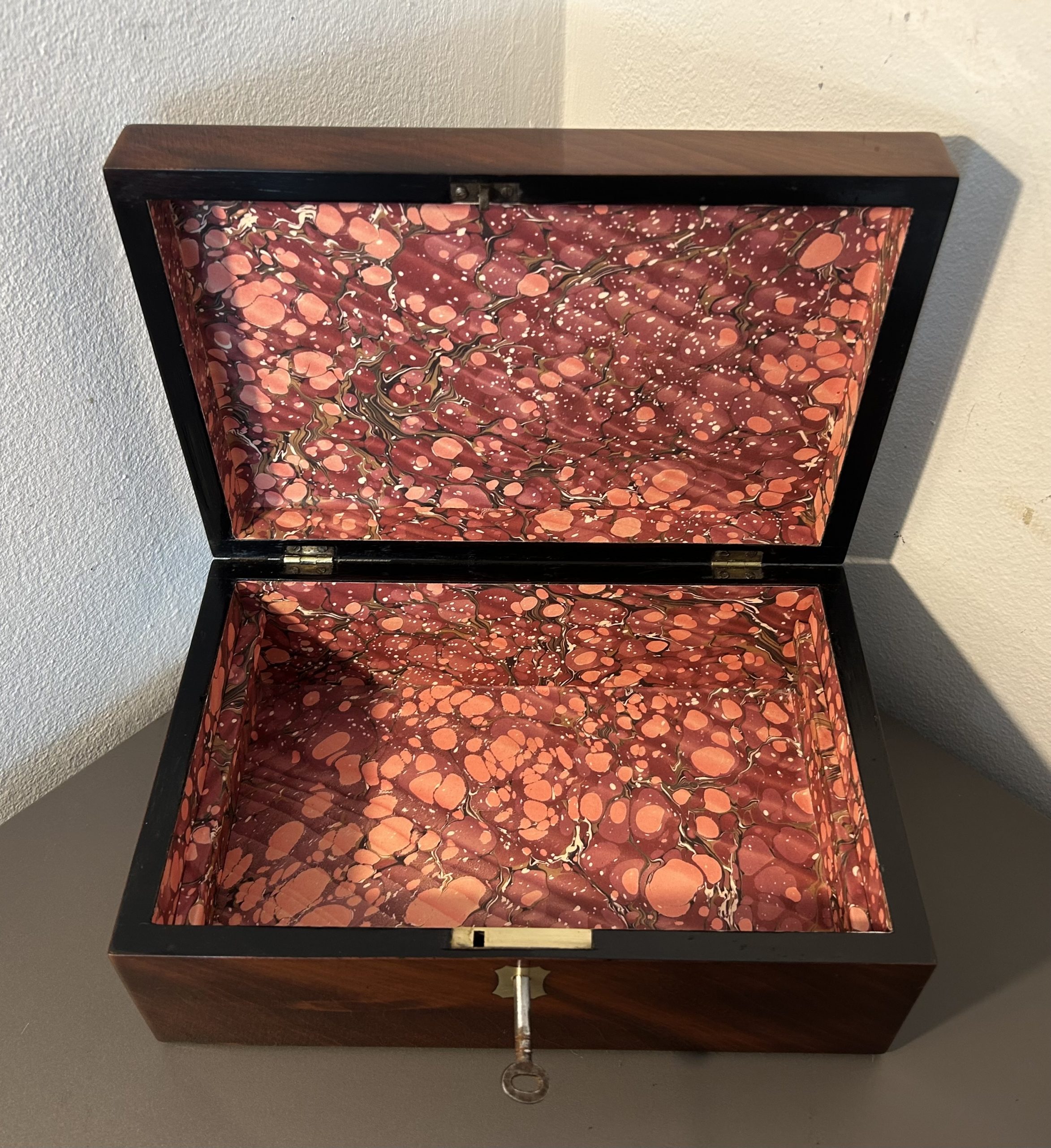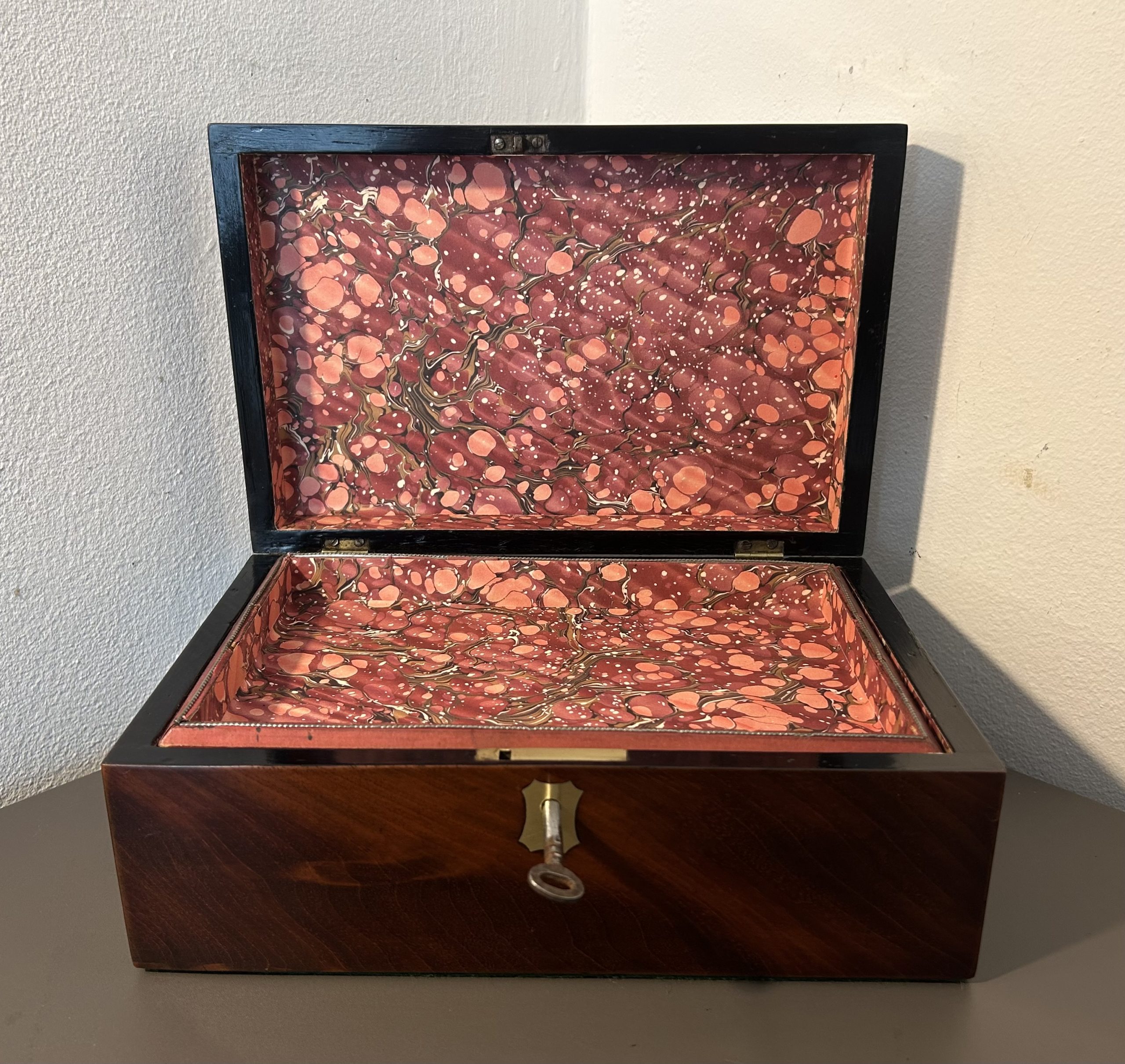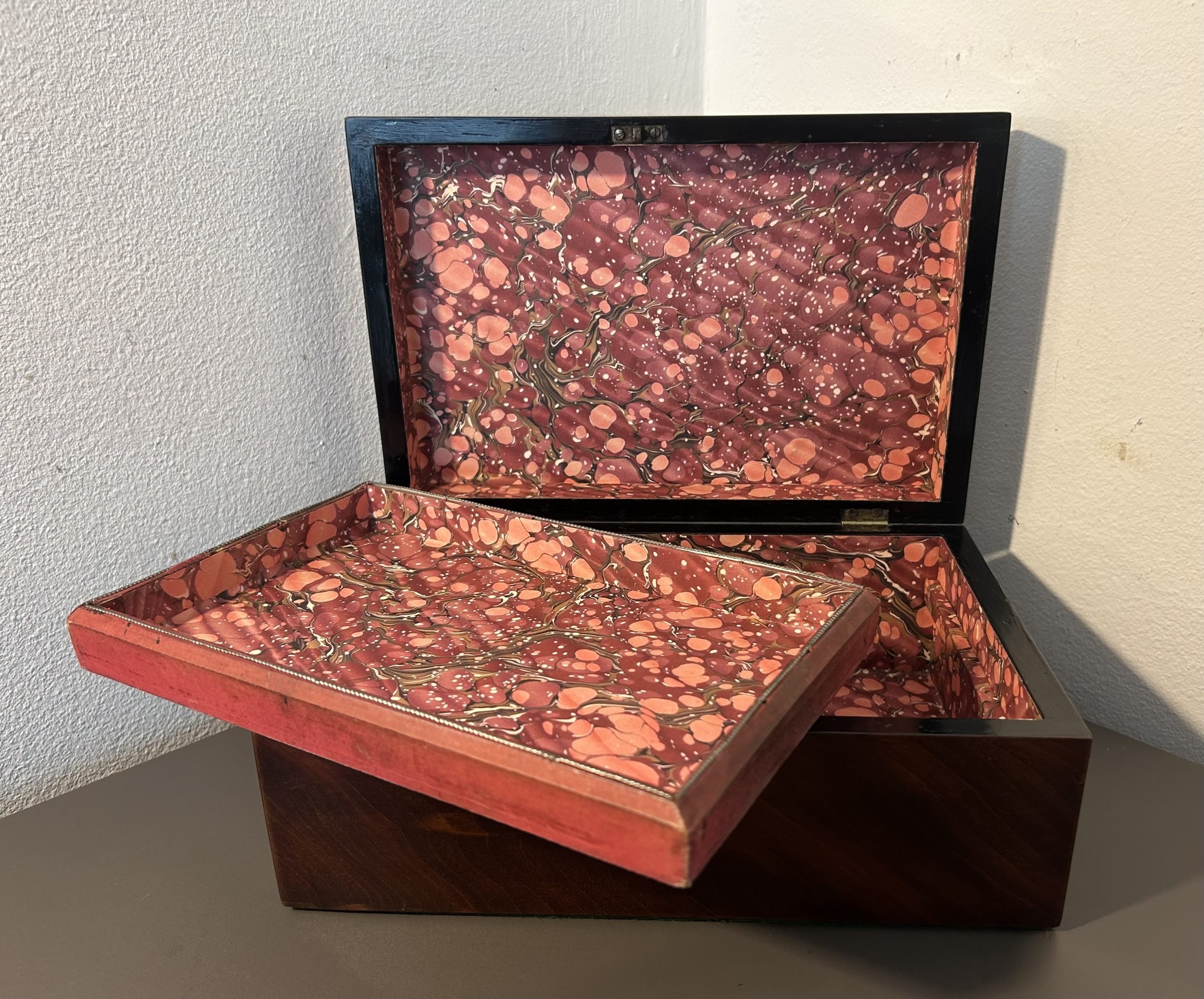 Open the box to reveal the original tray. We have professionally relined the interior and tray with handcrafted marble paper.