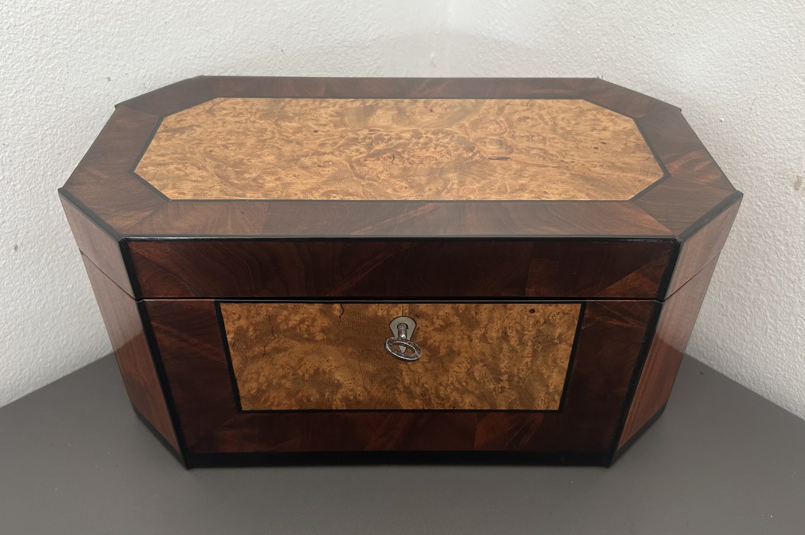 The box is made up of beautiful woods such as burr amboyna, flame mahogany and padook. Featuring a mother of pearl key escutcheon and a working lock and key.