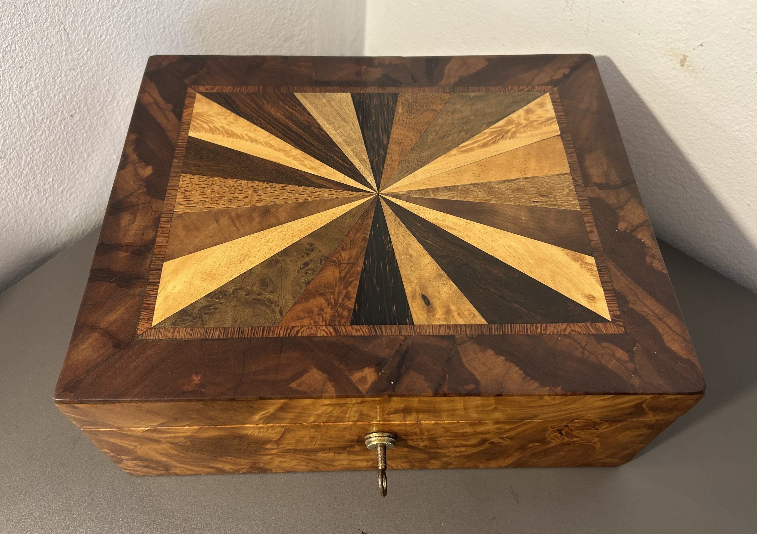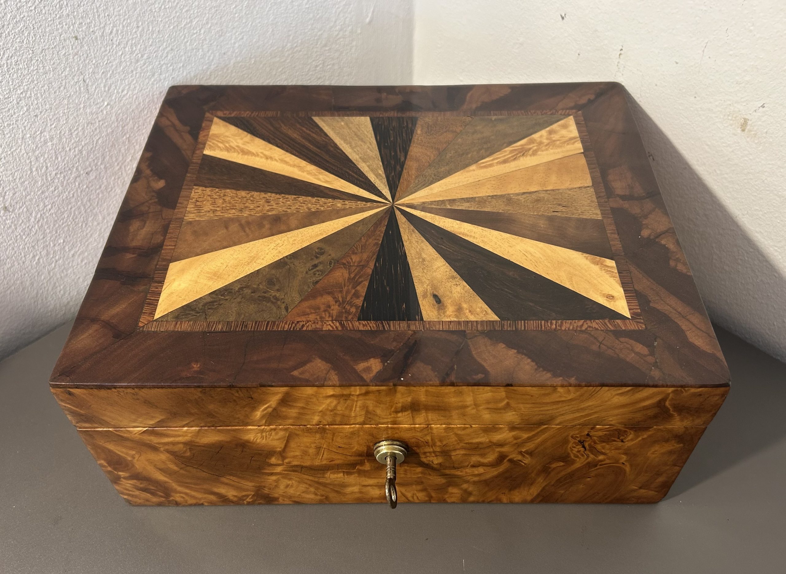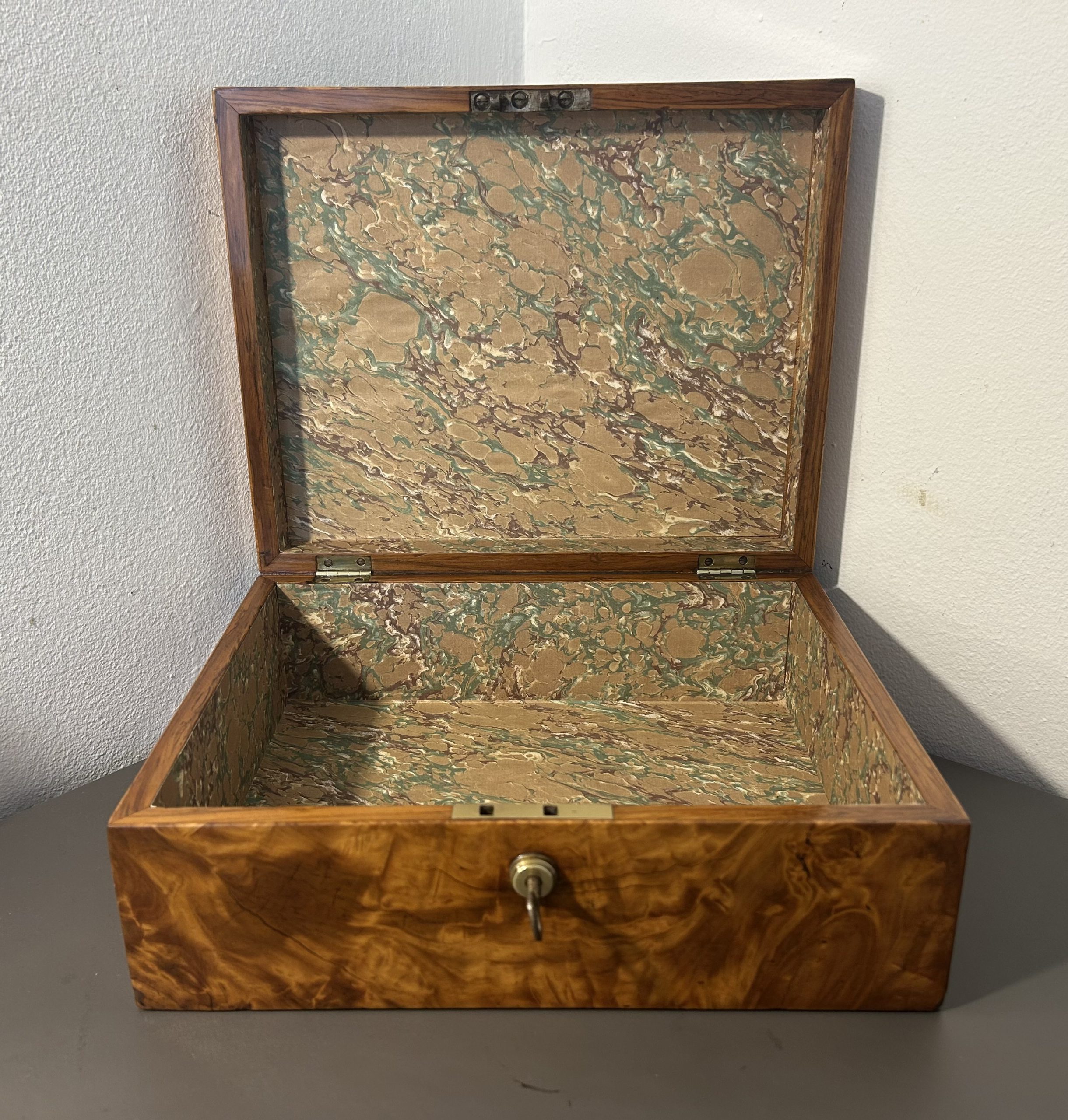 The box has a beautiful specimen wood design to the top with woods such as Kingwood, Amboyna and Burr maple. The interior has been relined with the perfect handcrafted marble paper to match the colouring of the box.