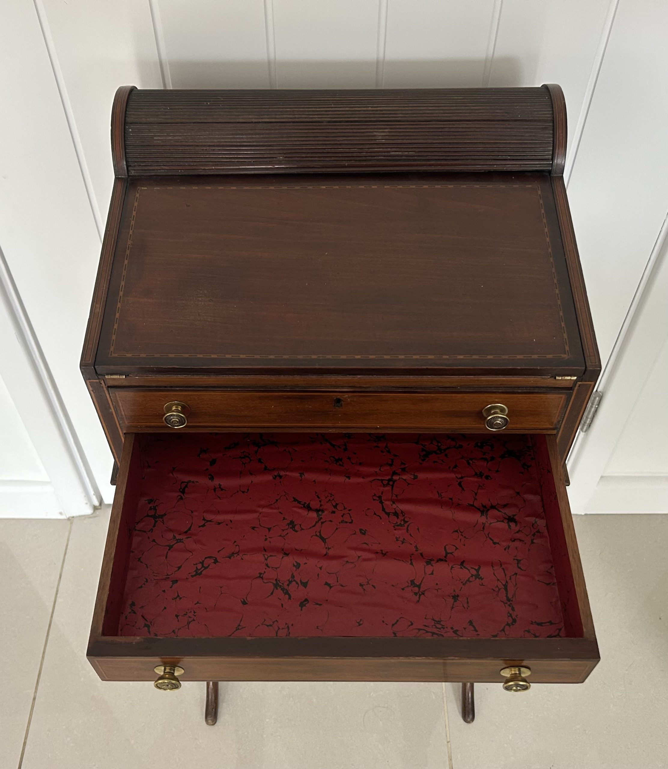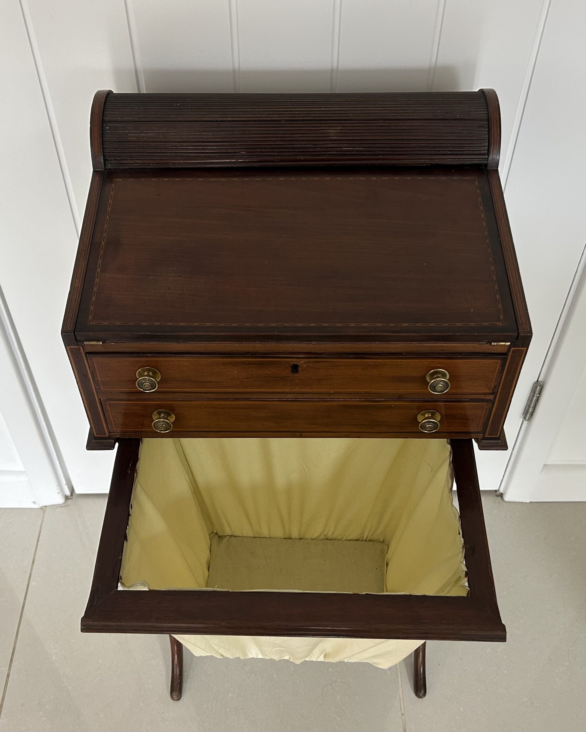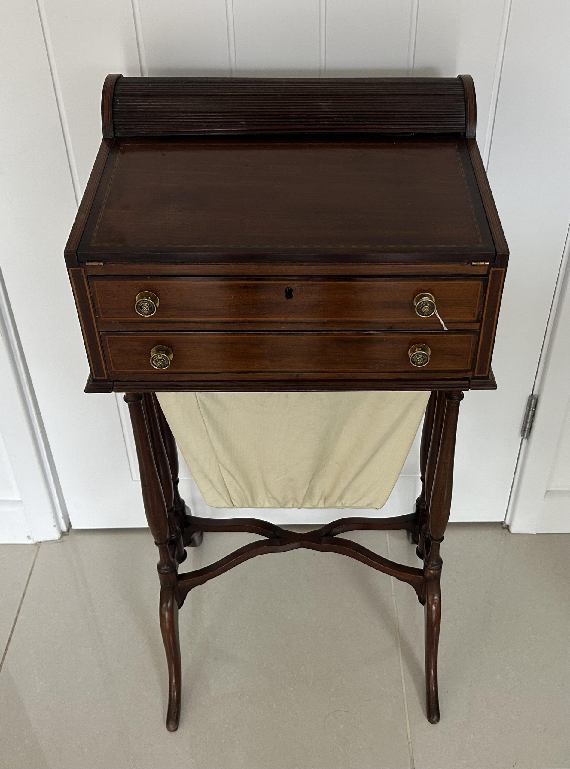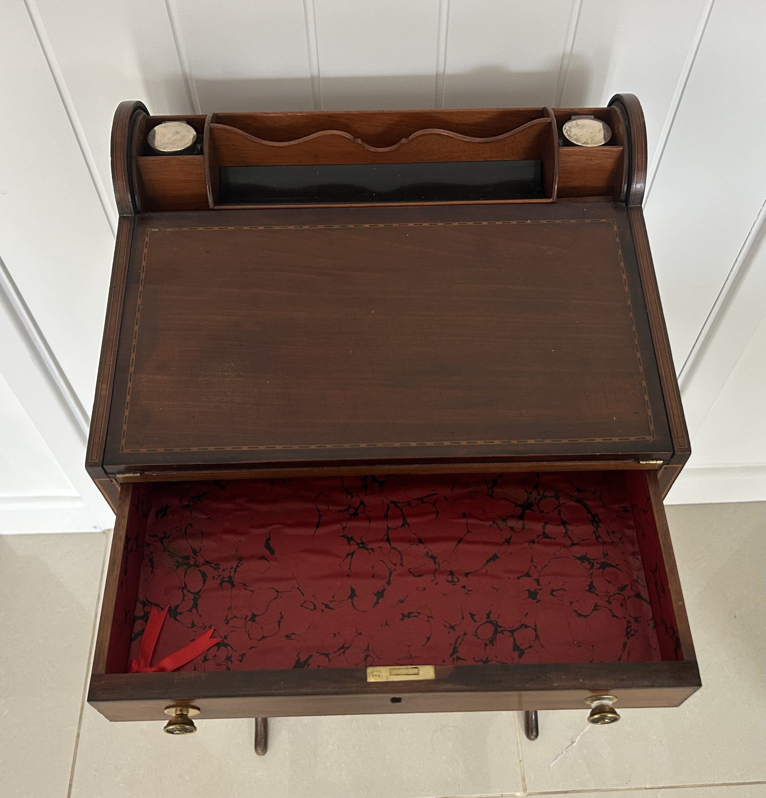 Open the top drawer to bring down the tambour top which features two ink well sections with silver topped inkwells, a stationary rack to the back a pen slope with section to the underneath. Bring the top of the box down to reveal a red releathered writing surface. The second drawer comes out to reveal a sewing basket to the underneath. The writing box sits on wonderful Mahogany legs.