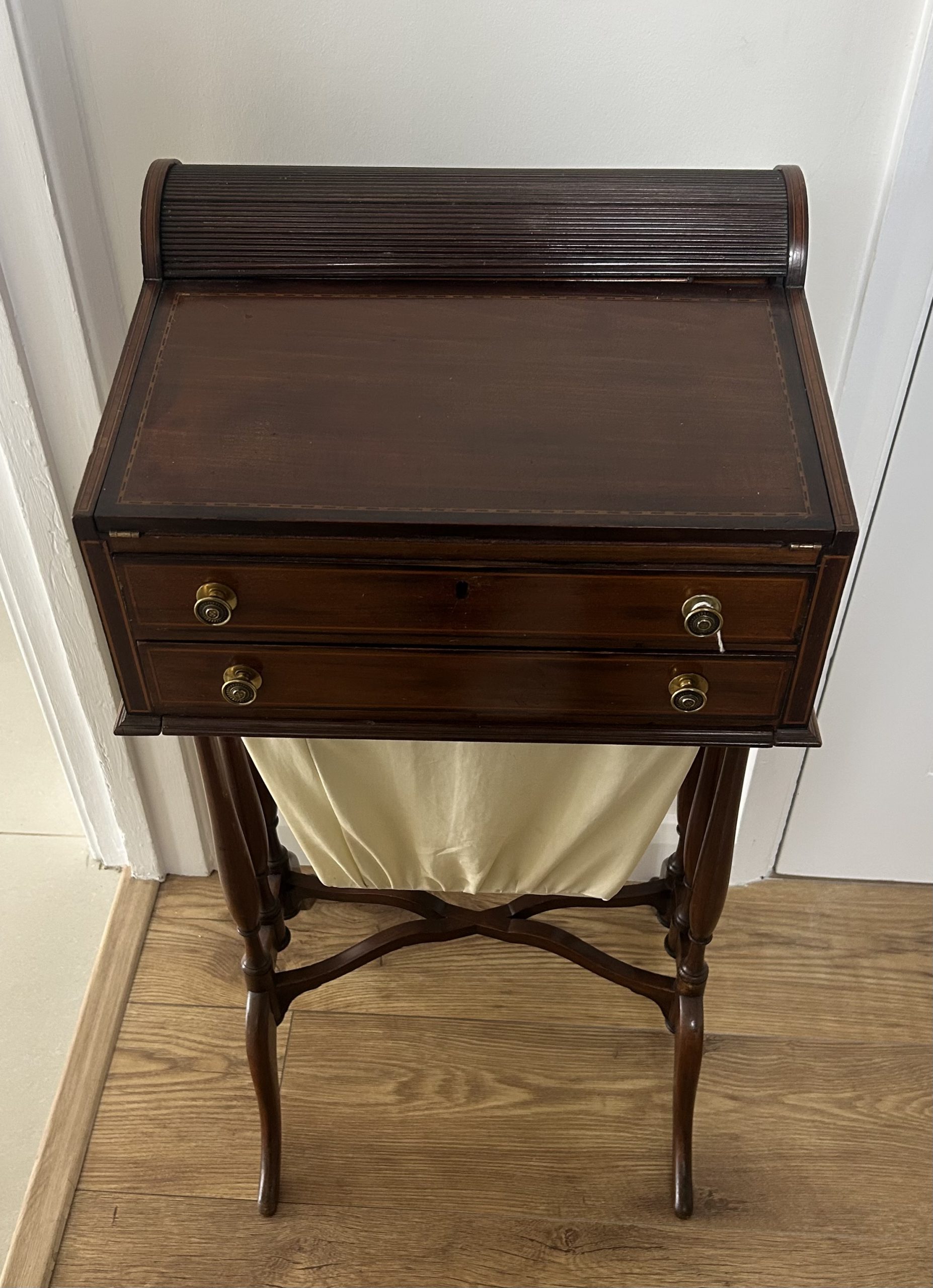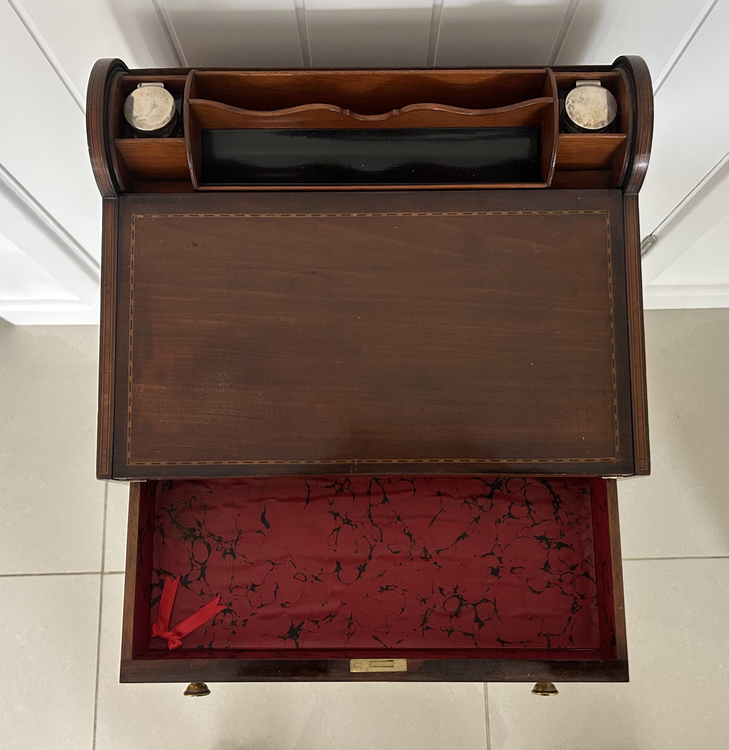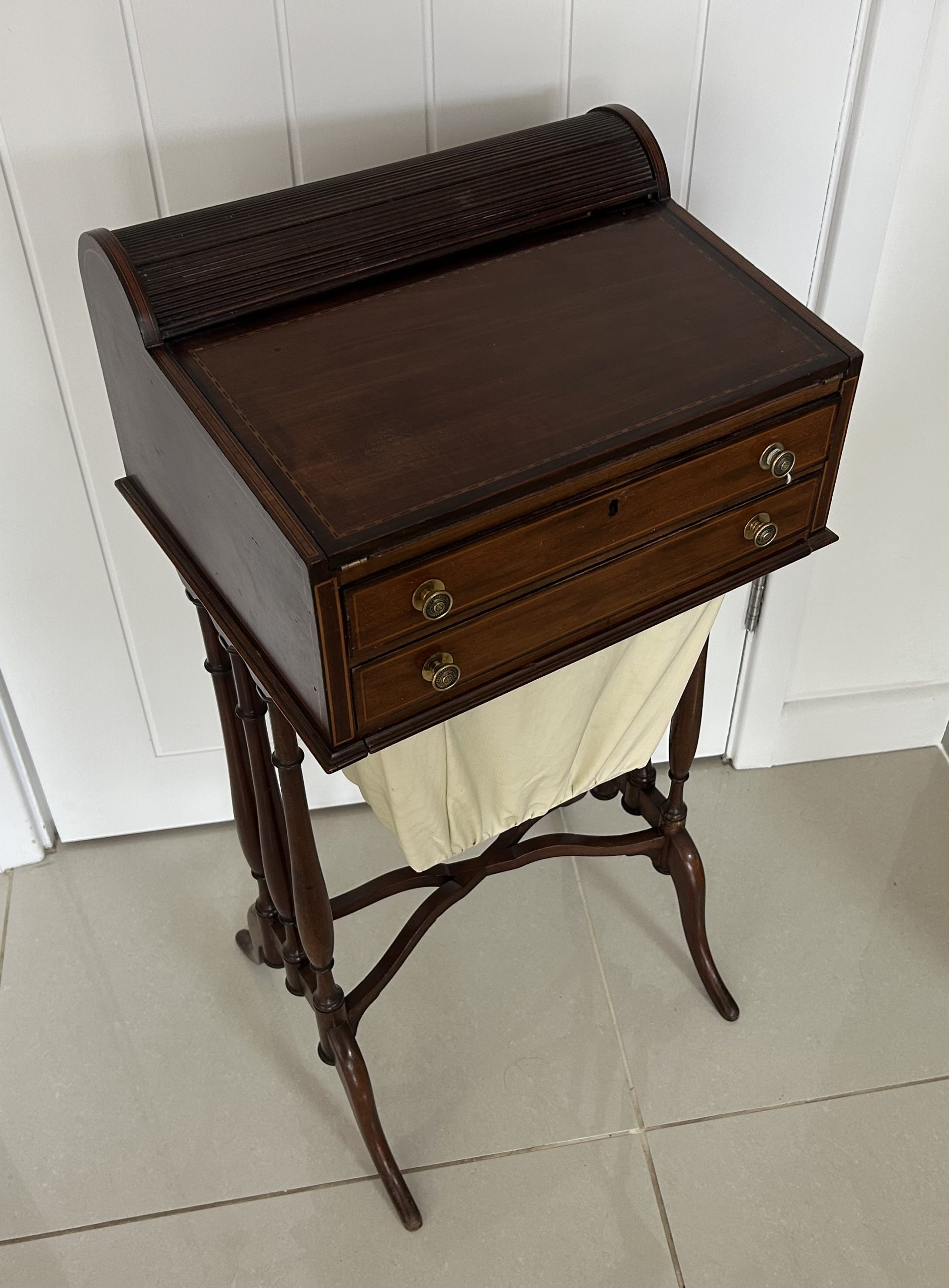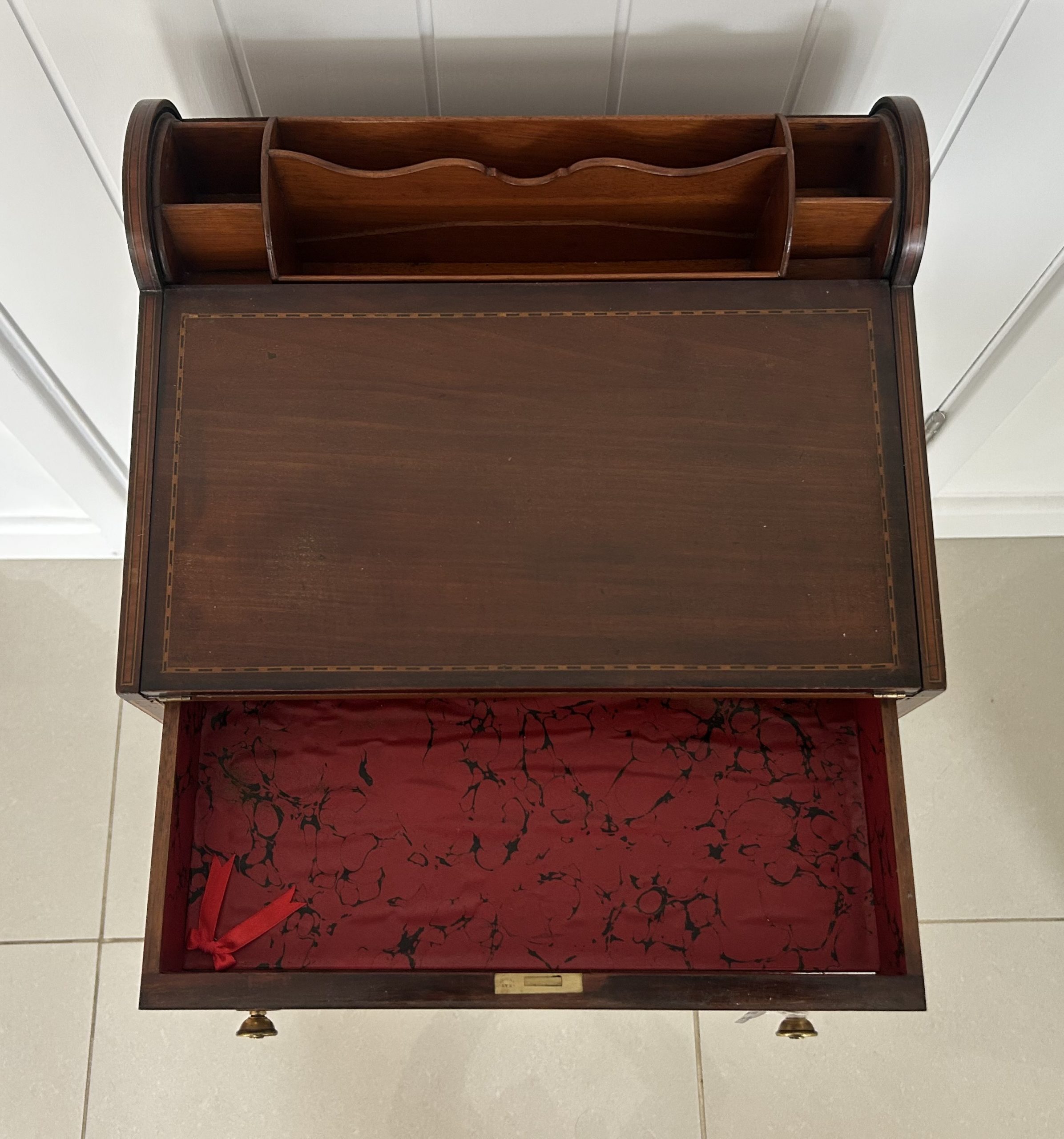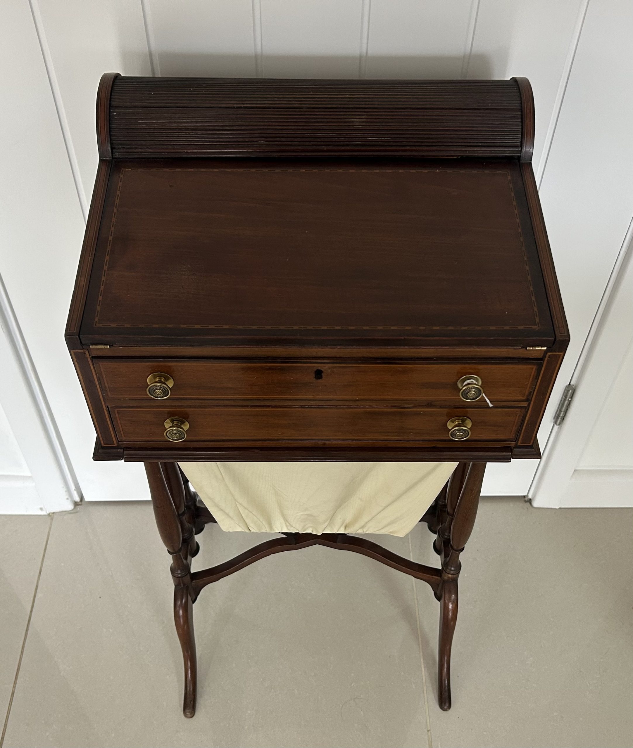 Open the top drawer to bring down the tambour top which features two ink well sections with silver topped inkwells, a stationary rack to the back a pen slope with section to the underneath. Bring the top of the box down to reveal a red releathered writing surface. The second drawer comes out to reveal a sewing basket to the underneath. The writing box sits on wonderful Mahogany legs.