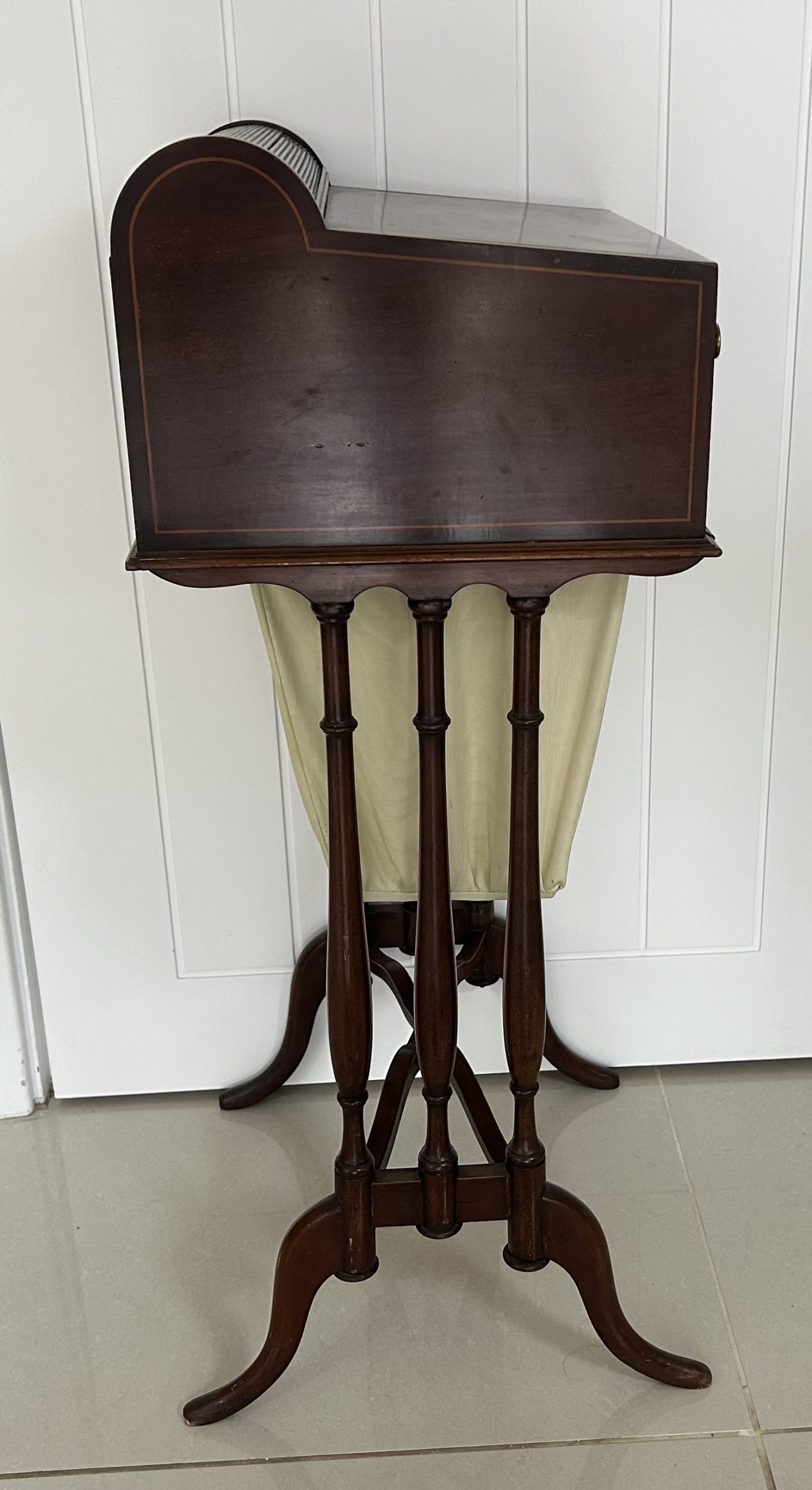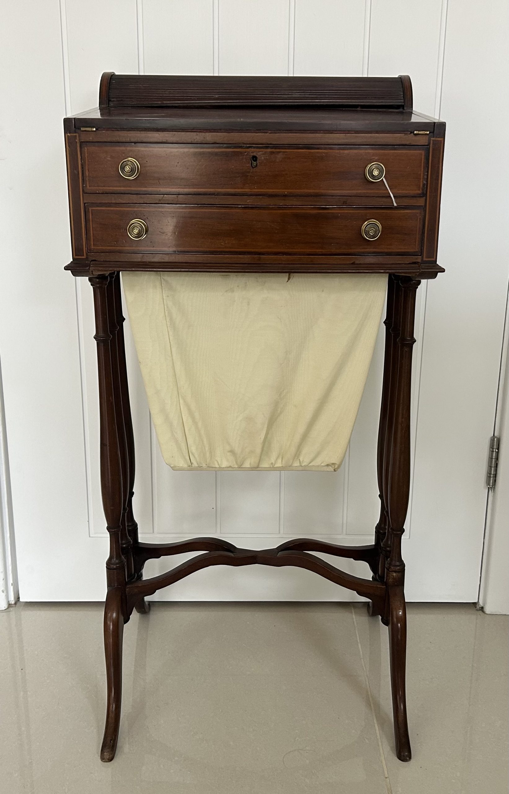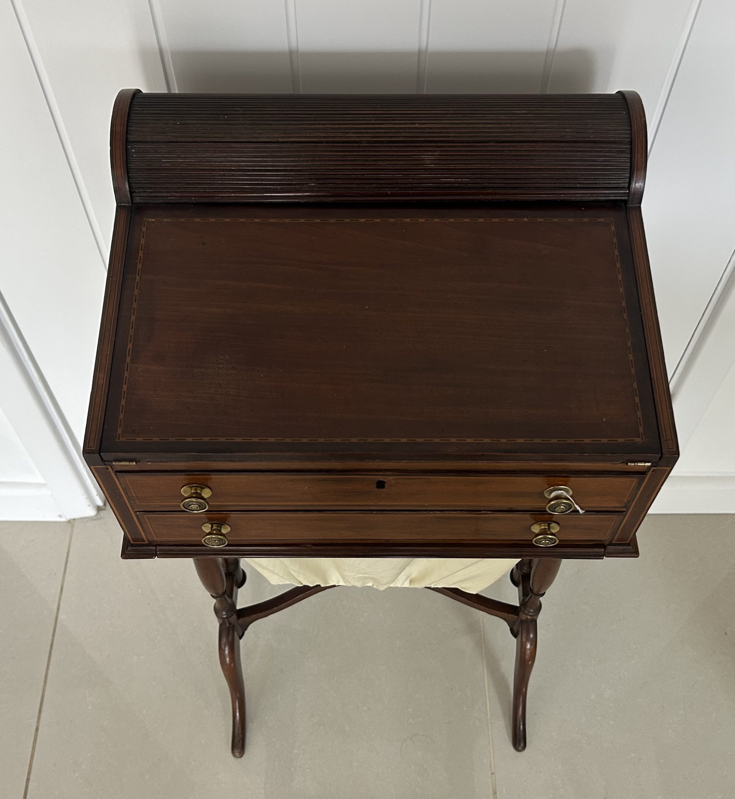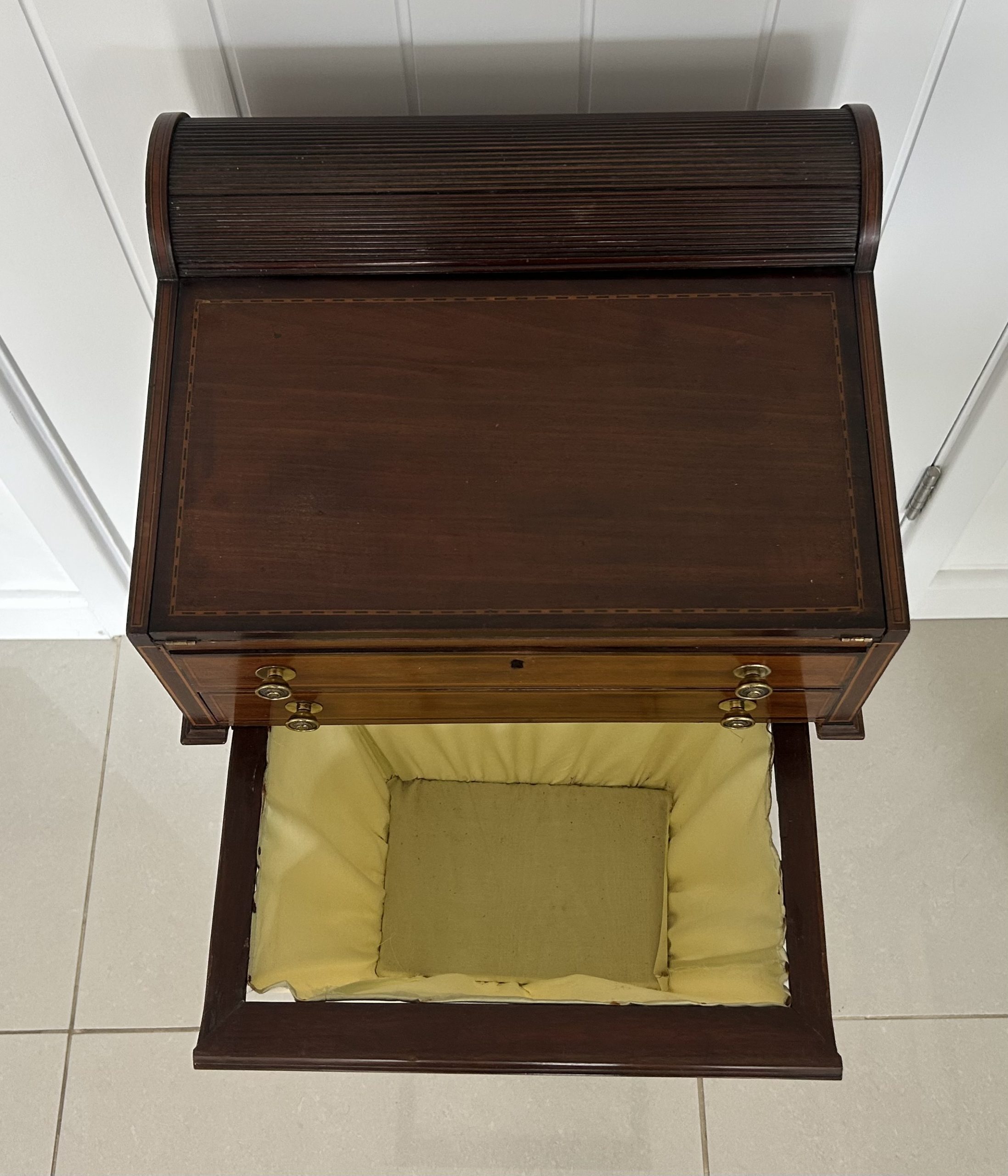 Open the top drawer to bring down the tambour top which features two ink well sections with silver topped inkwells, a stationary rack to the back a pen slope with section to the underneath. Bring the top of the box down to reveal a red releathered writing surface. The second drawer comes out to reveal a sewing basket to the underneath. The writing box sits on wonderful Mahogany legs.