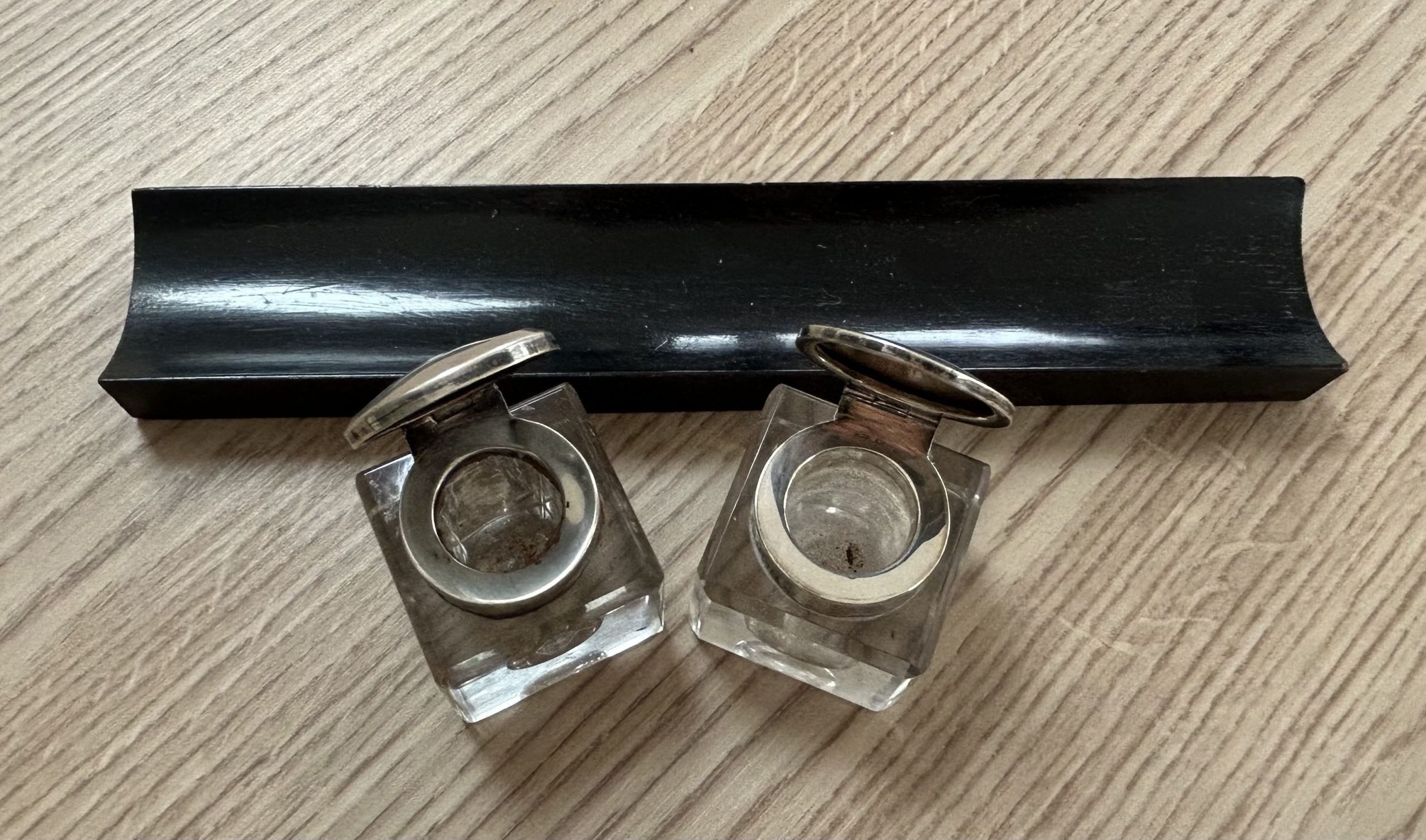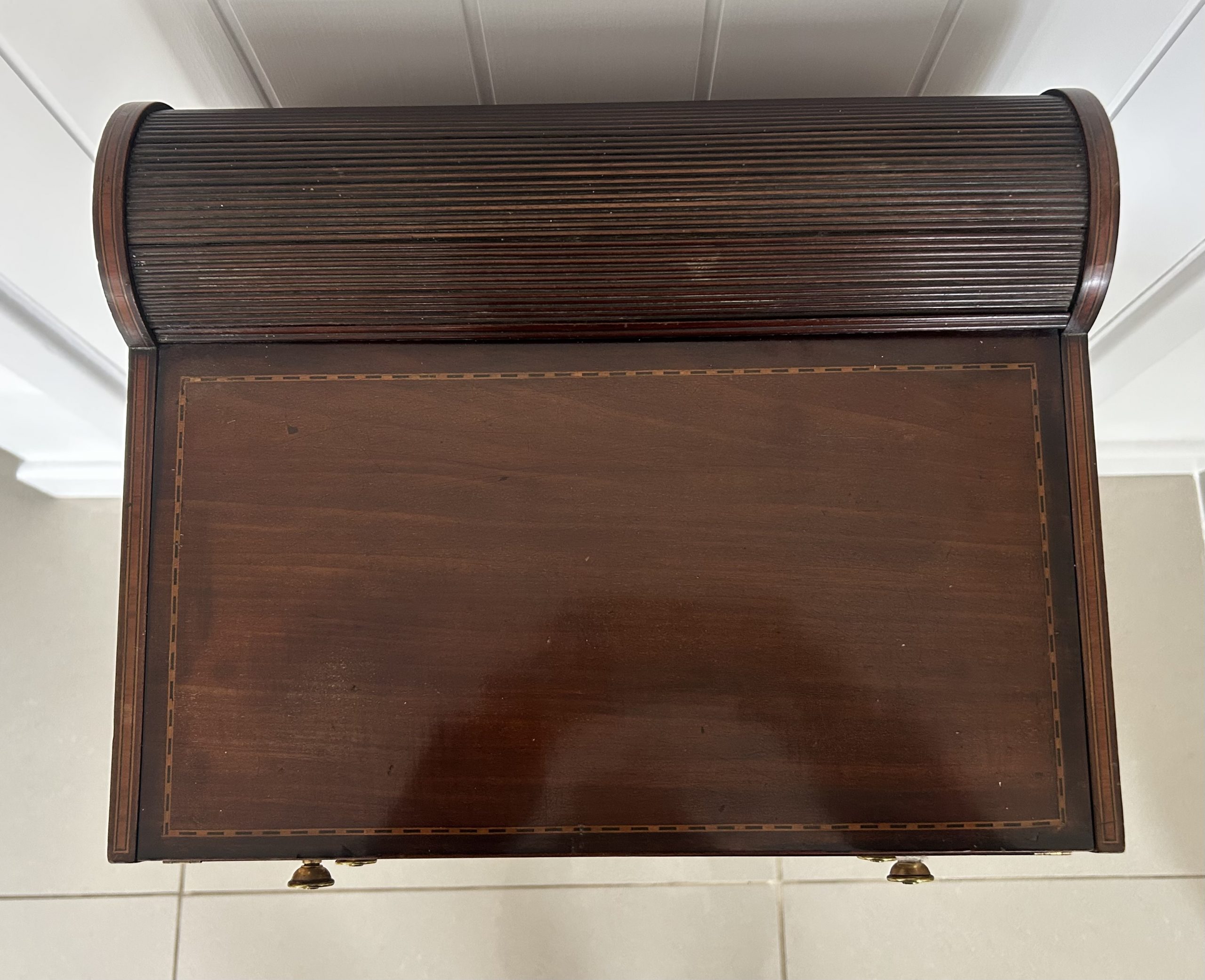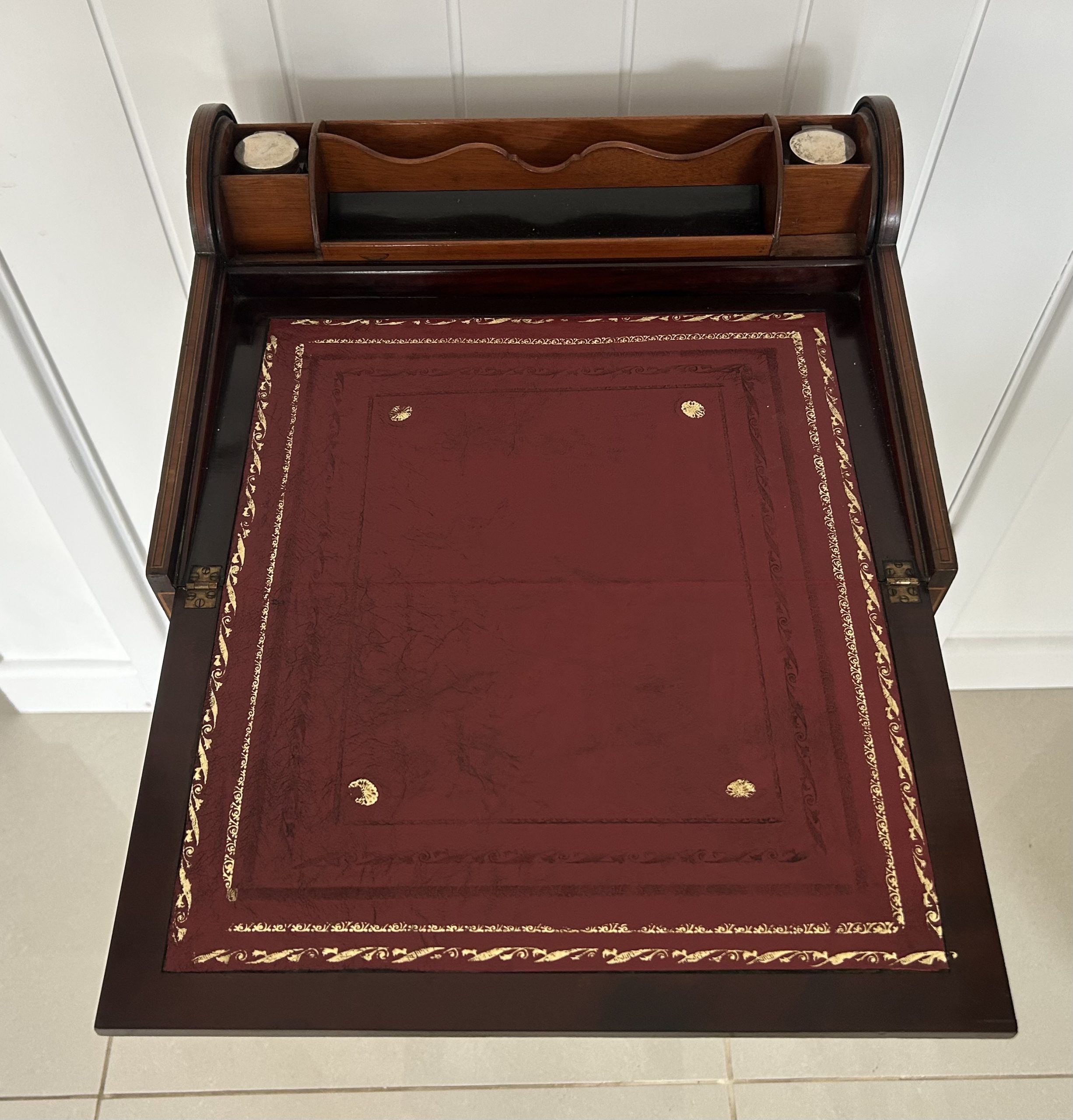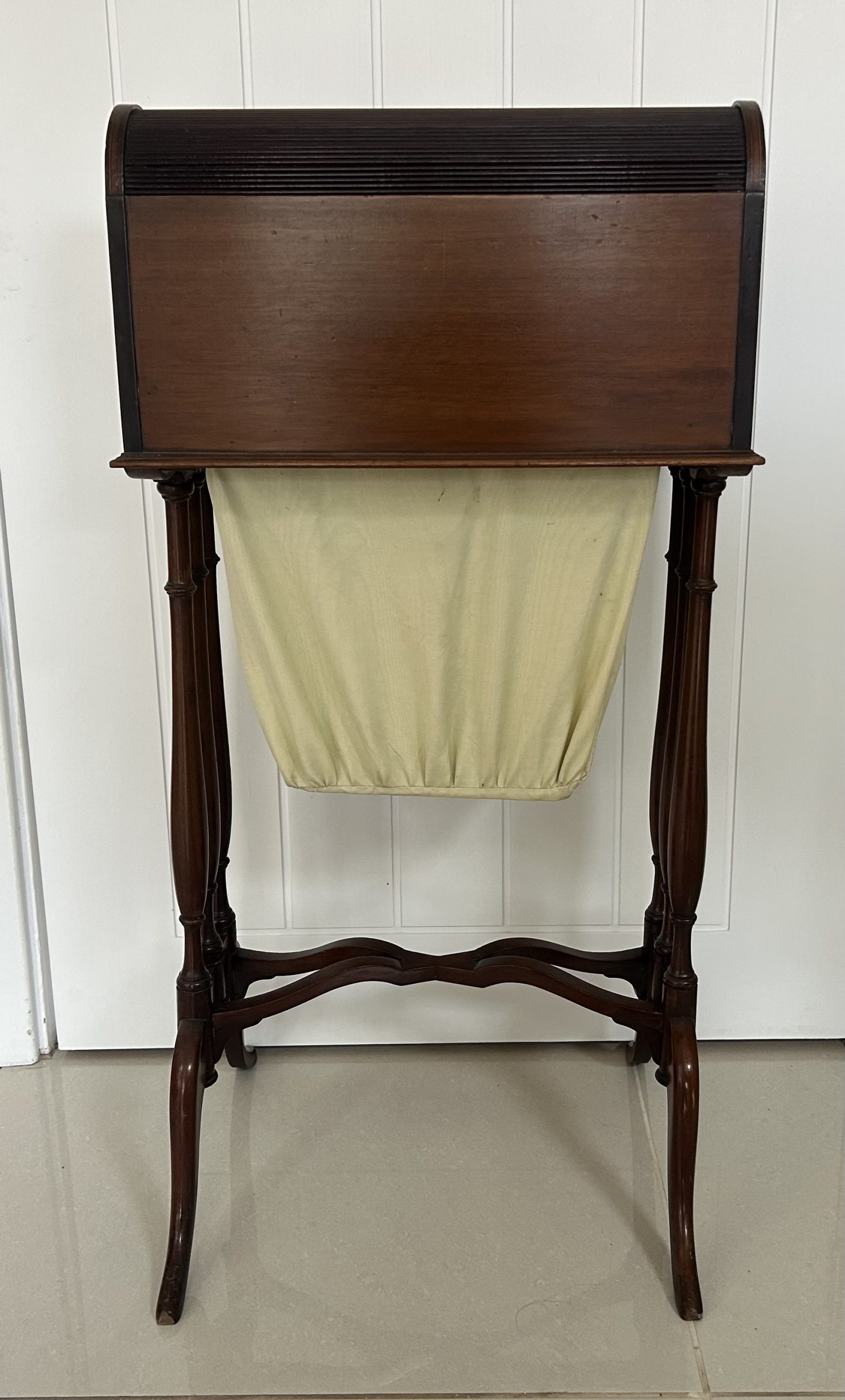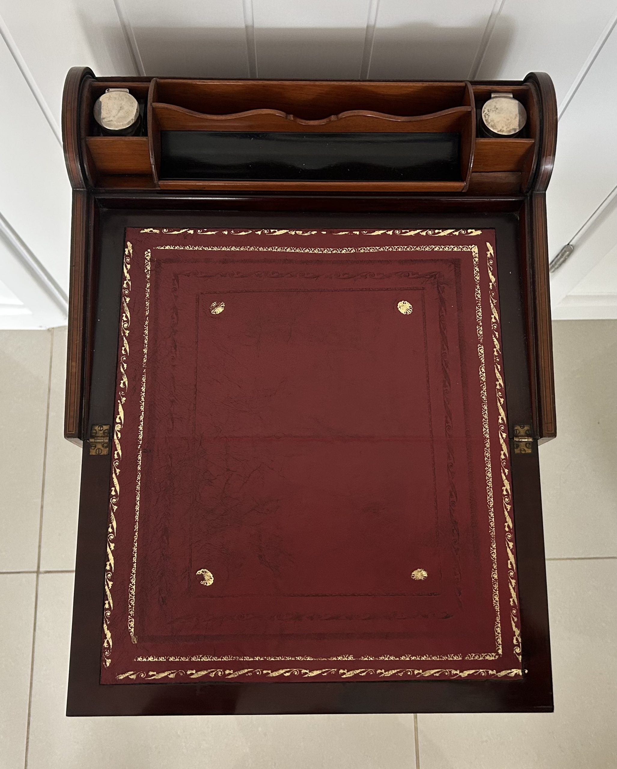 Open the top drawer to bring down the tambour top which features two ink well sections with silver topped inkwells, a stationary rack to the back a pen slope with section to the underneath. Bring the top of the box down to reveal a red releathered writing surface. The second drawer comes out to reveal a sewing basket to the underneath. The writing box sits on wonderful Mahogany legs.