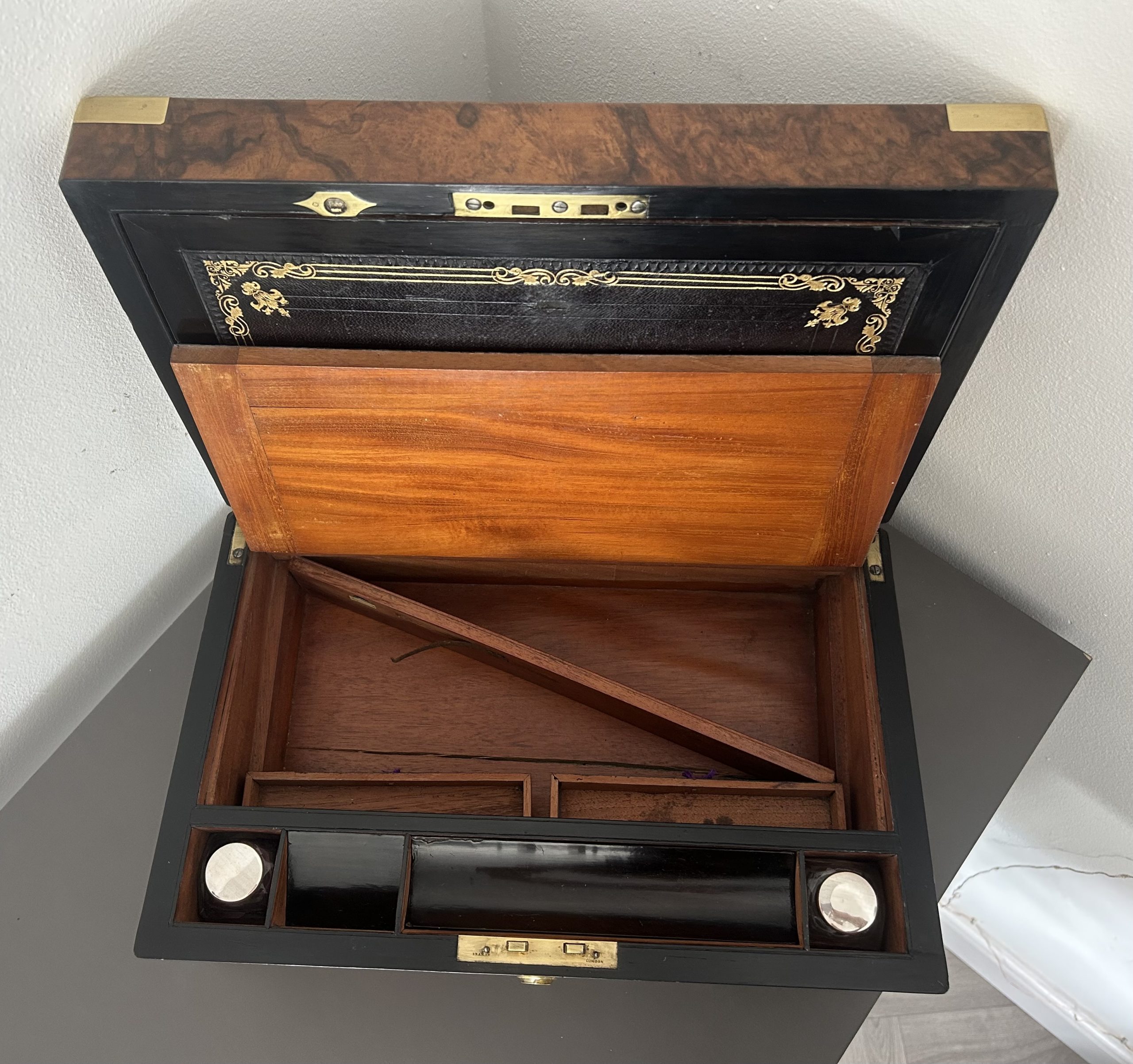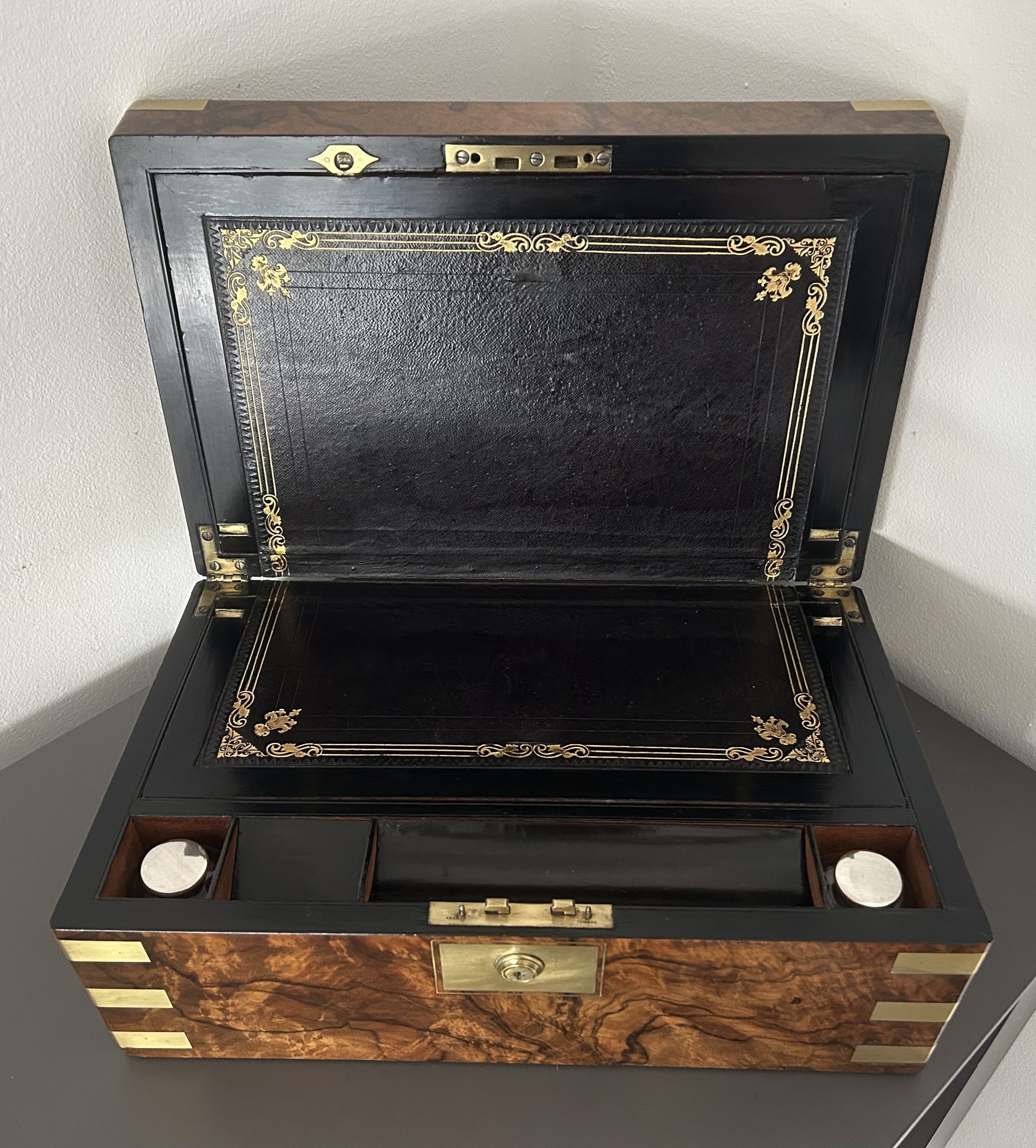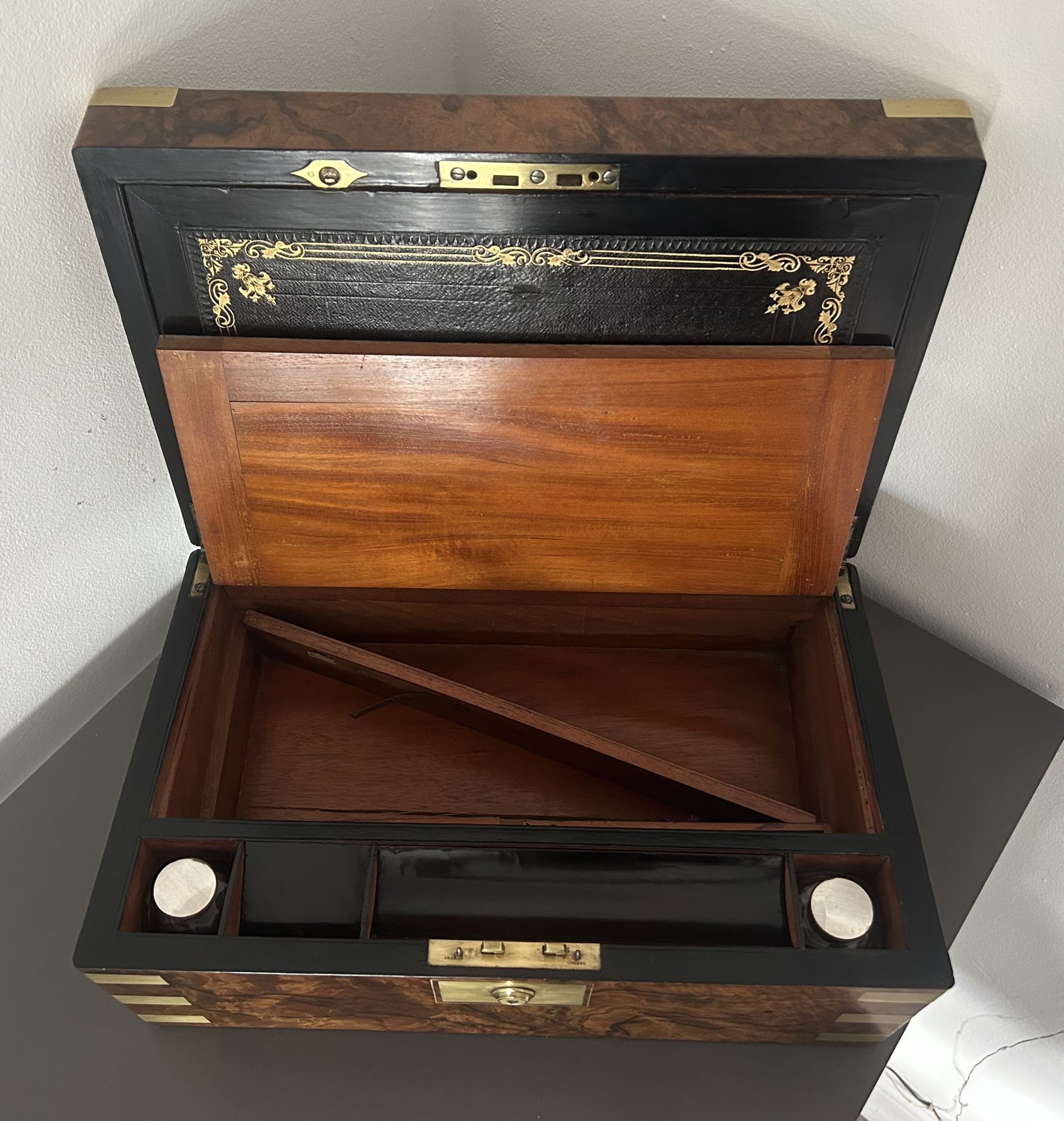 An outstanding example of a Victorian Brassbound walnut writing slope