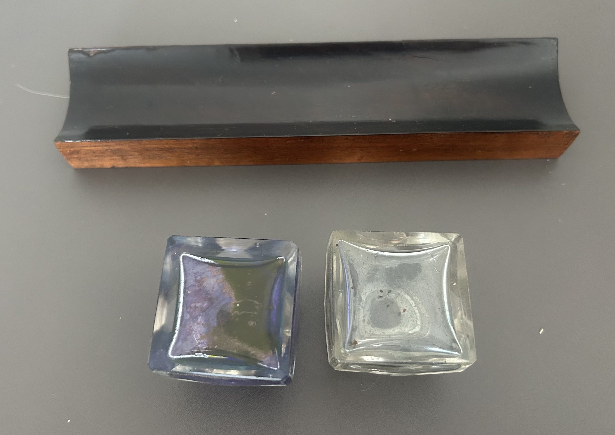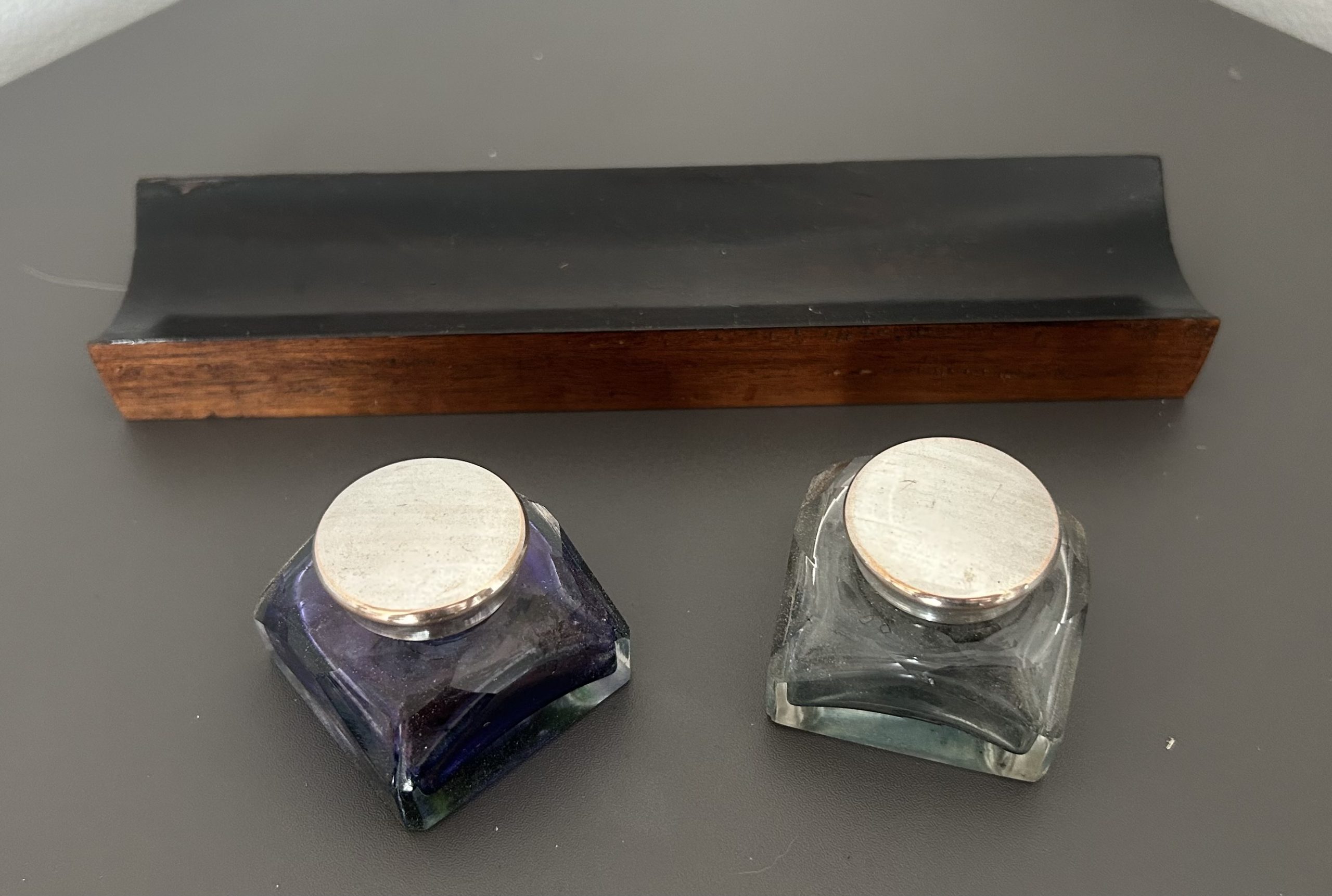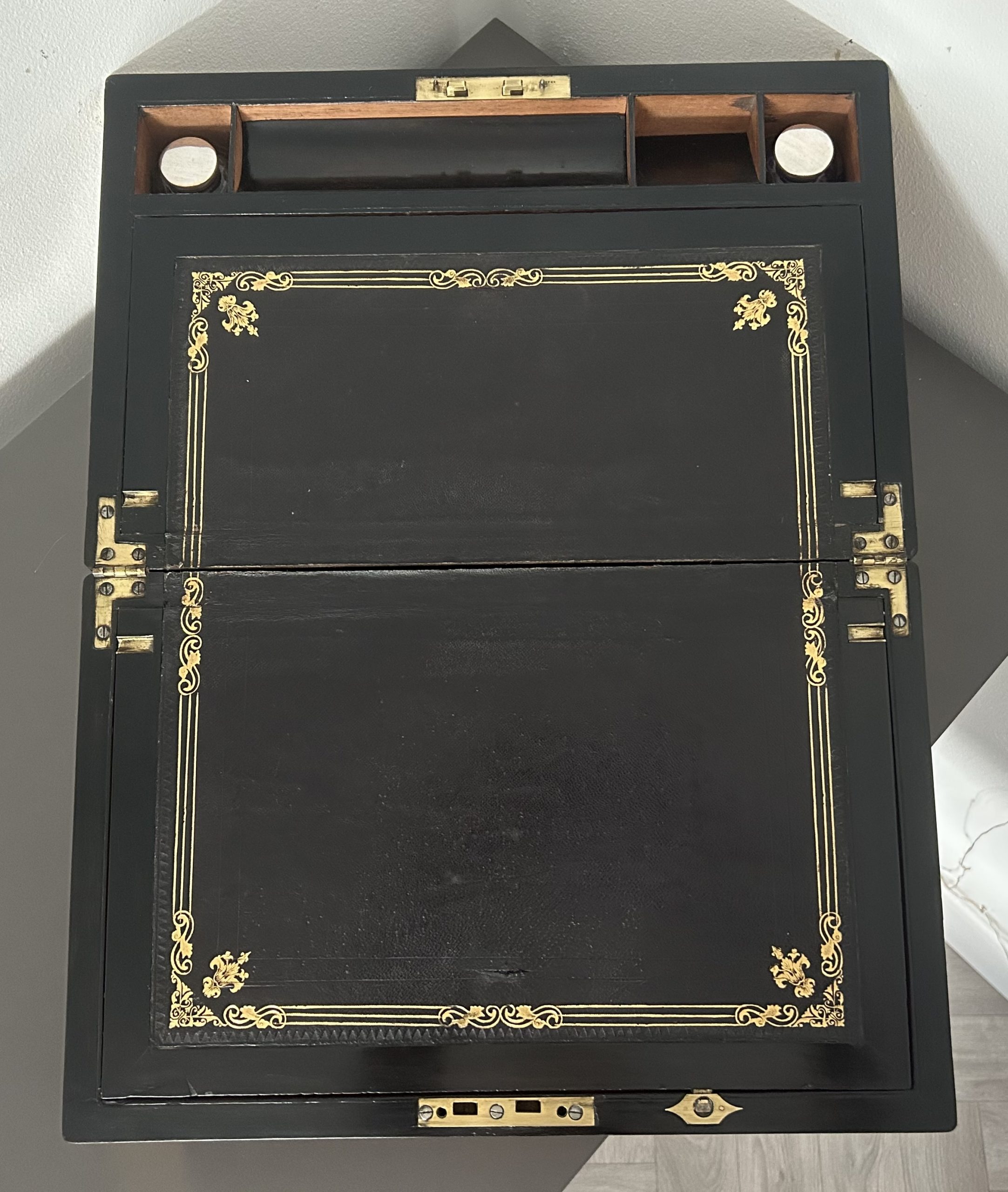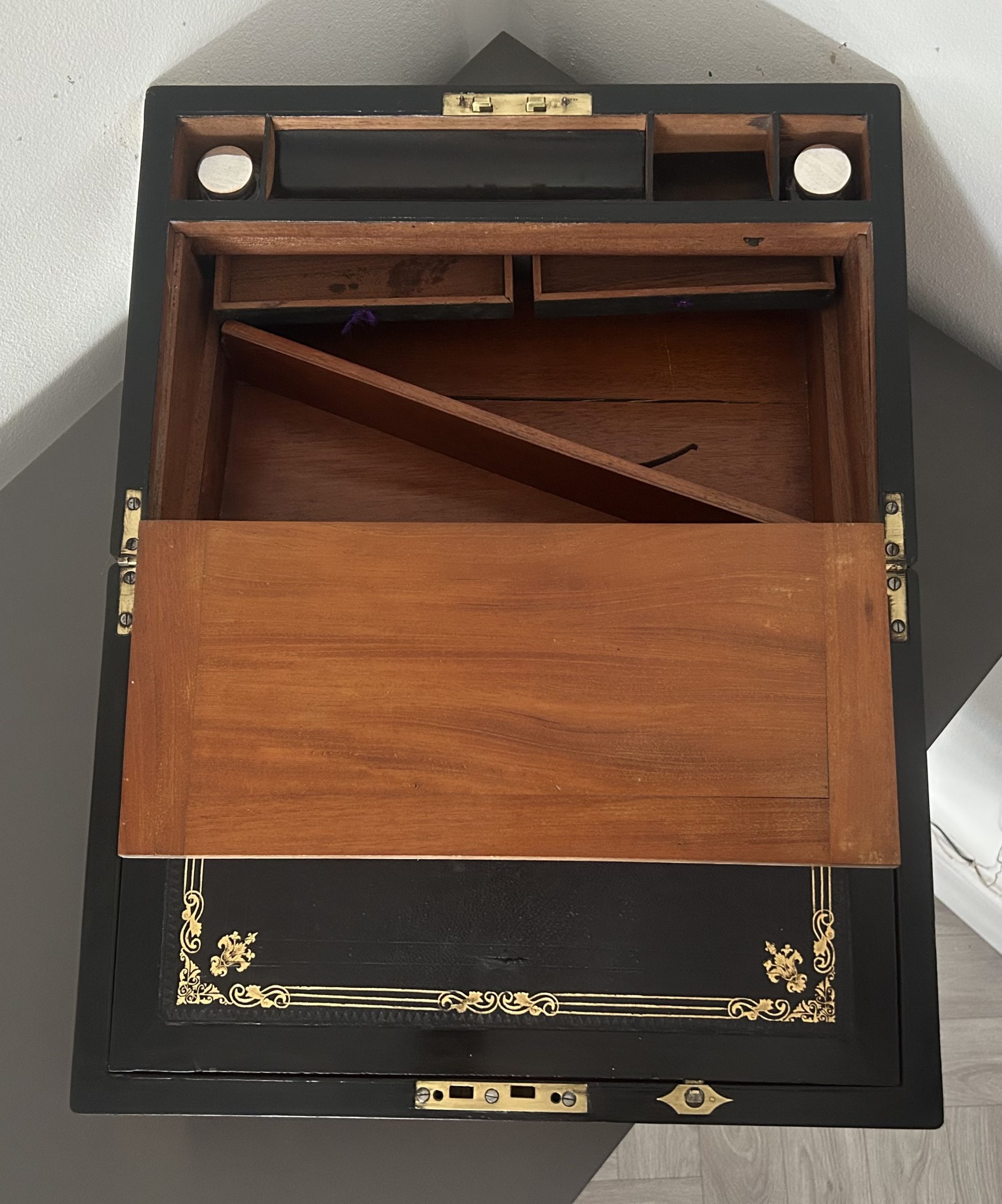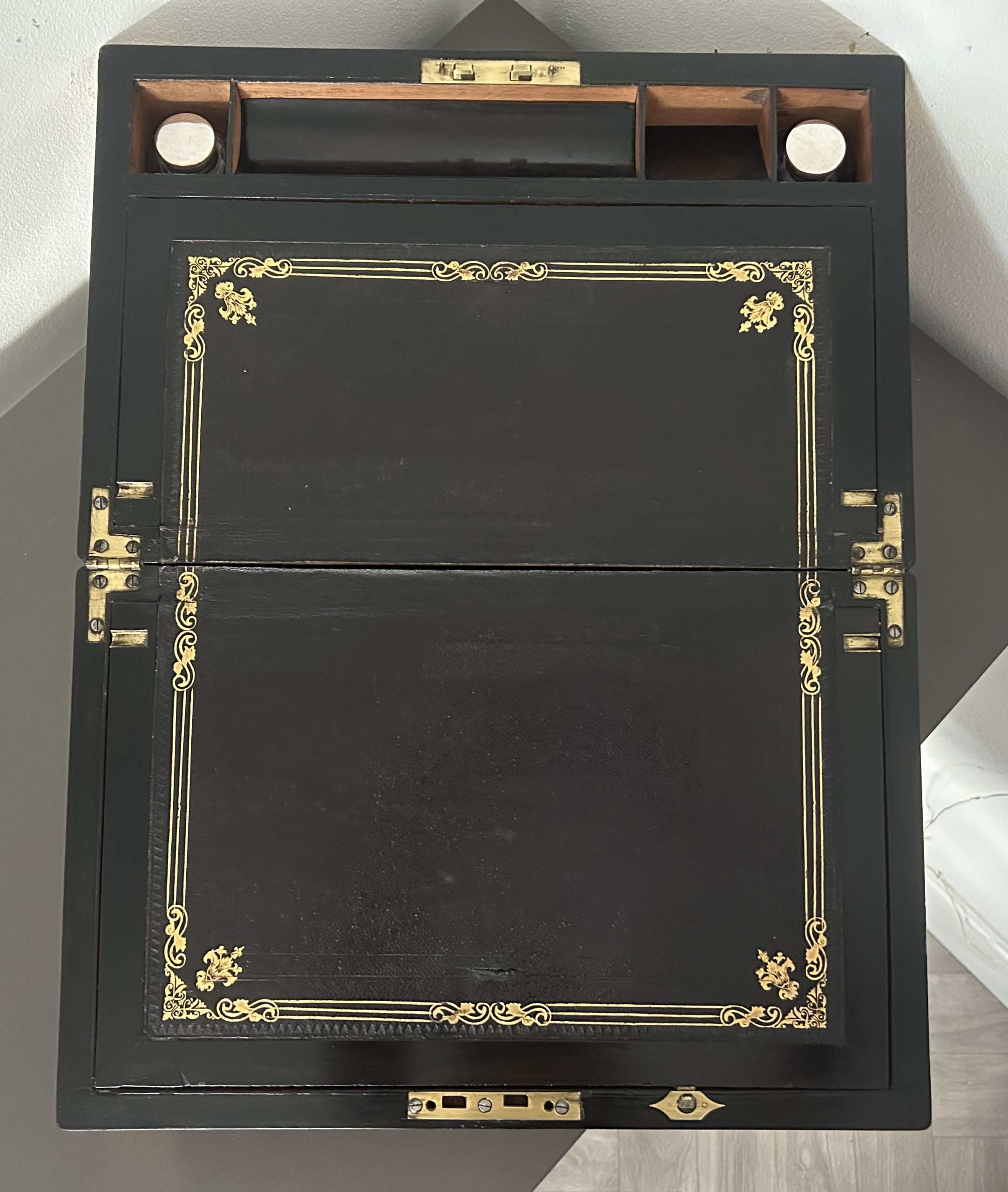 Open the box to reveal a coromandel interior with a mahogany lining , A black leather writing surface , a nib and pen slope and two ink well sections complete with ink wells. The box also features three secret drawers underneath the writing surface to access them pull up the divider between the nib slope and inkwell. Behind the back of the inside lid features space for paperwork.