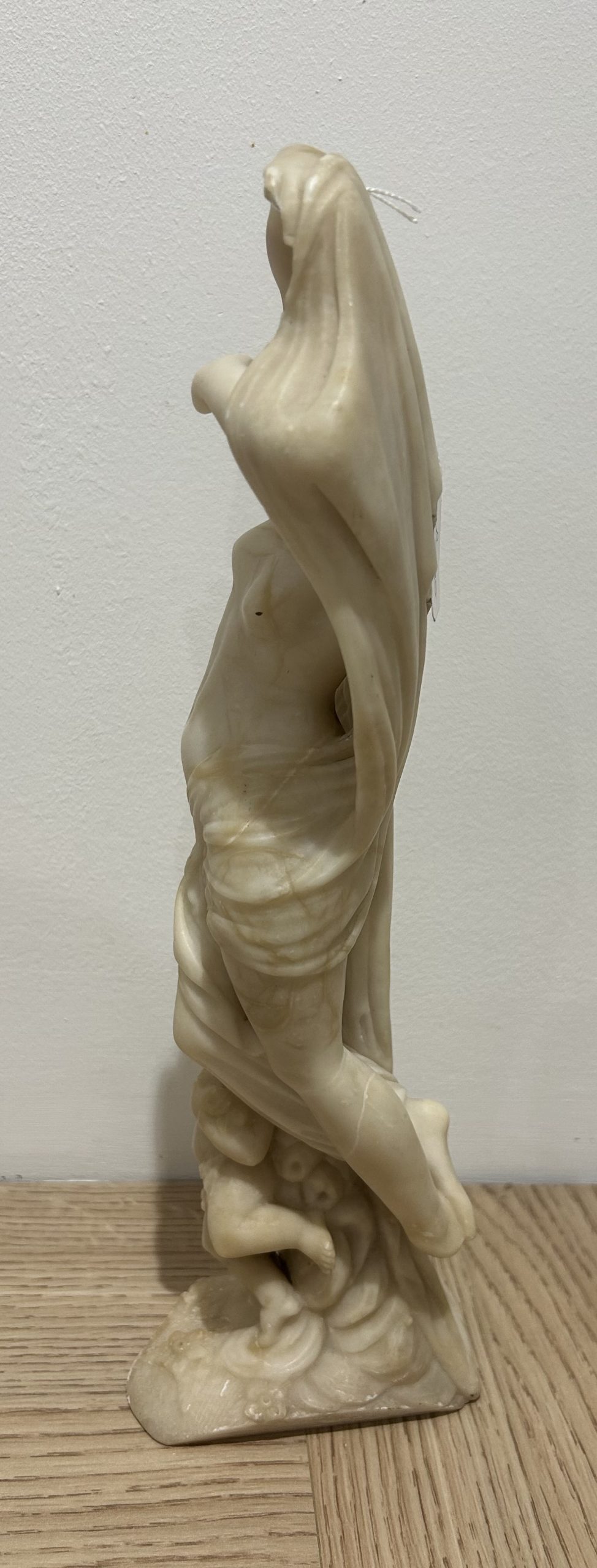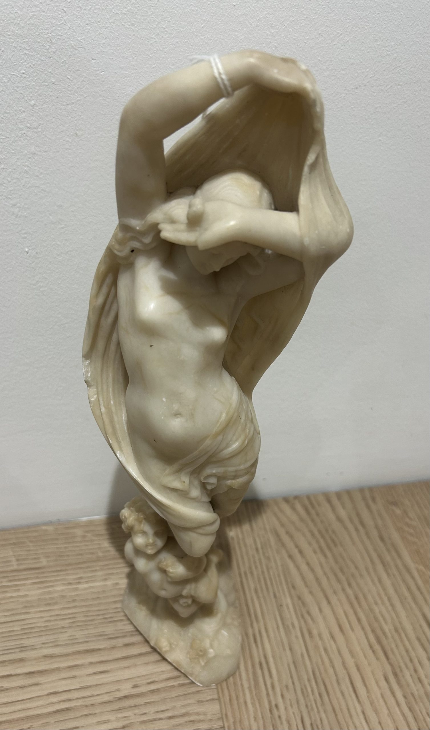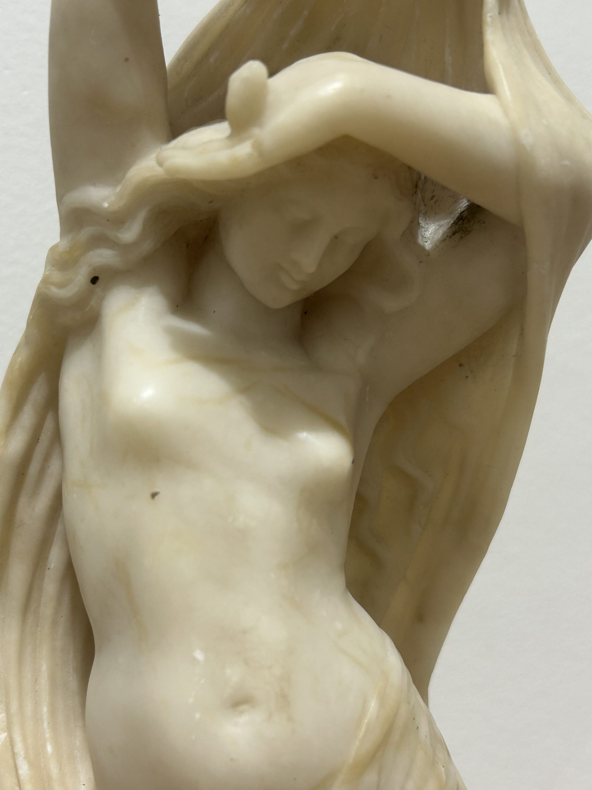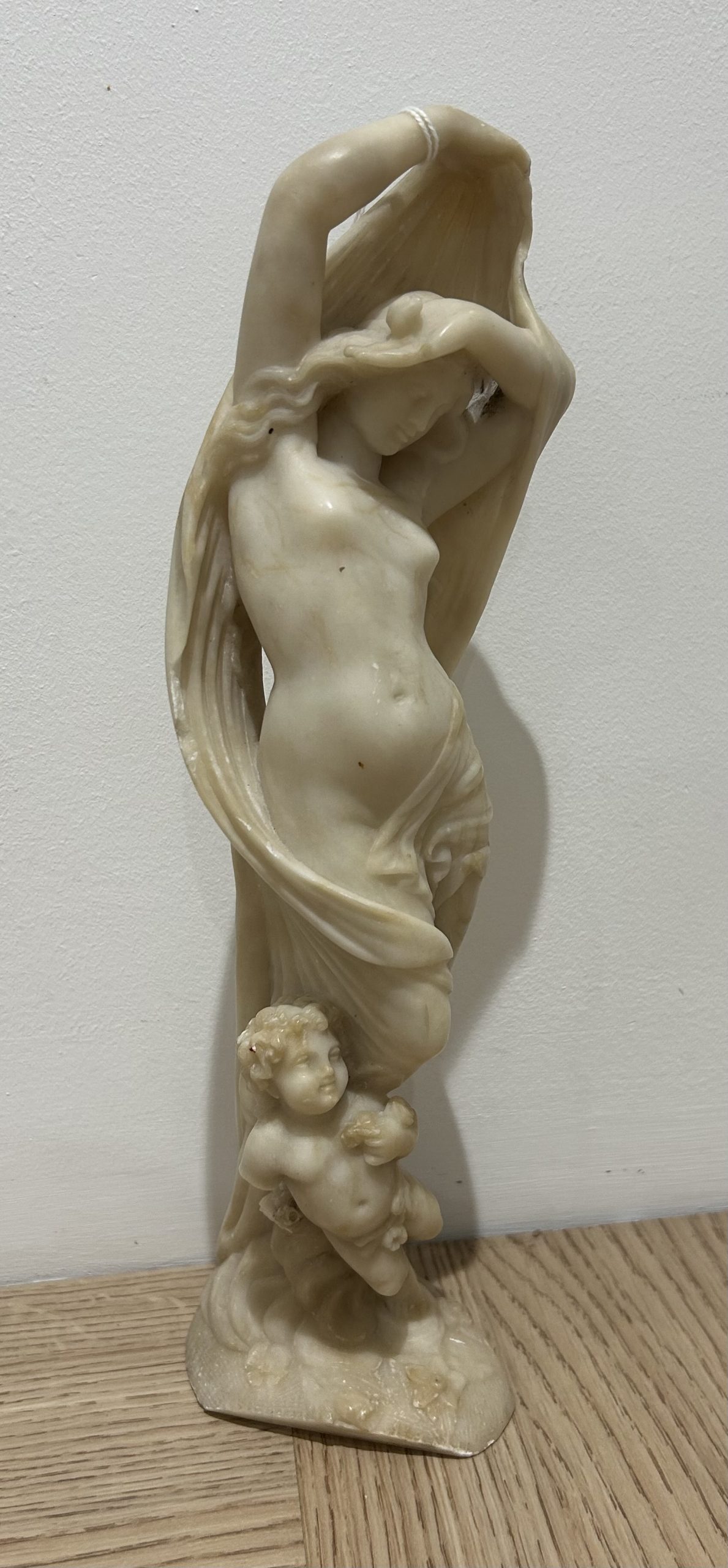 A superb example of a 19th century classical figure in carved alabaster. A beautifully carved figure of a semi naked maiden holding a cloth with her cherub at her feet. The figure has a few very tiny marks but in overall superb detail and condition measuring 8 x 10 and stands 33cm high.