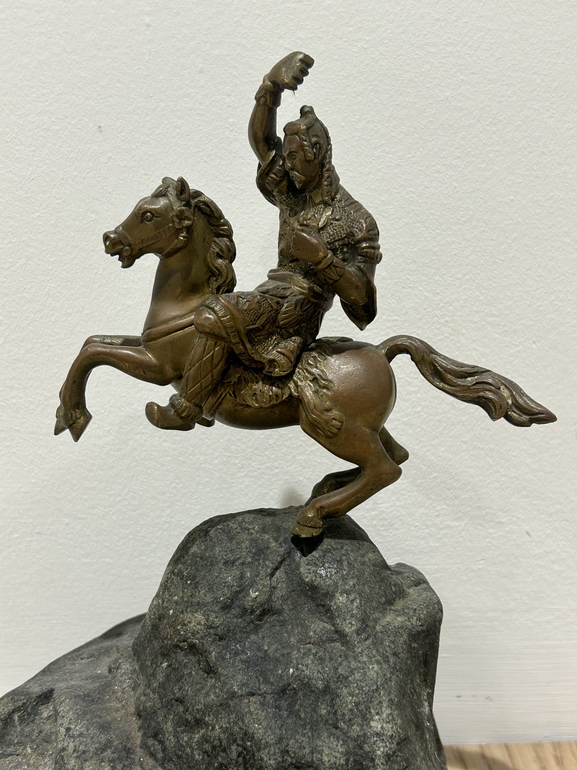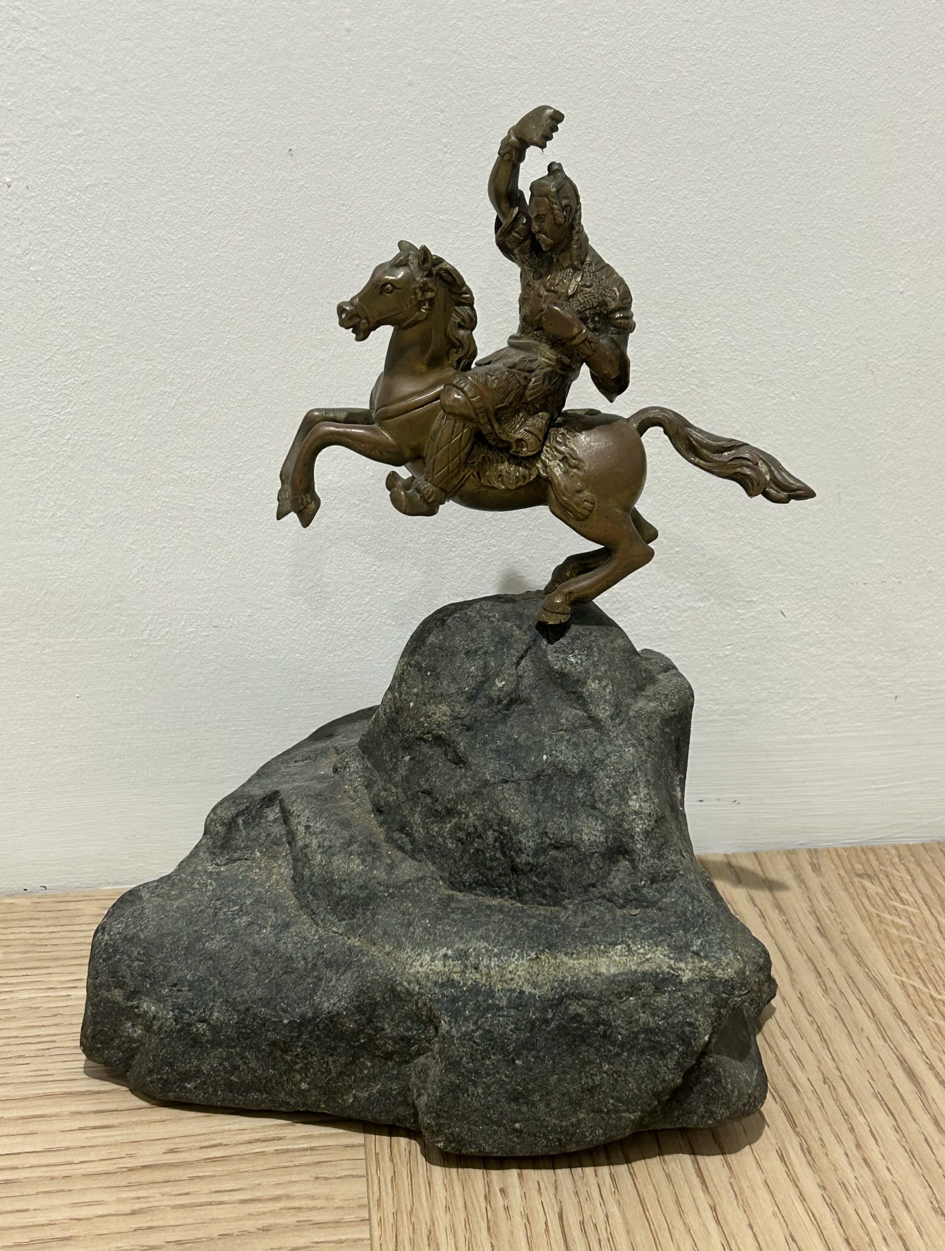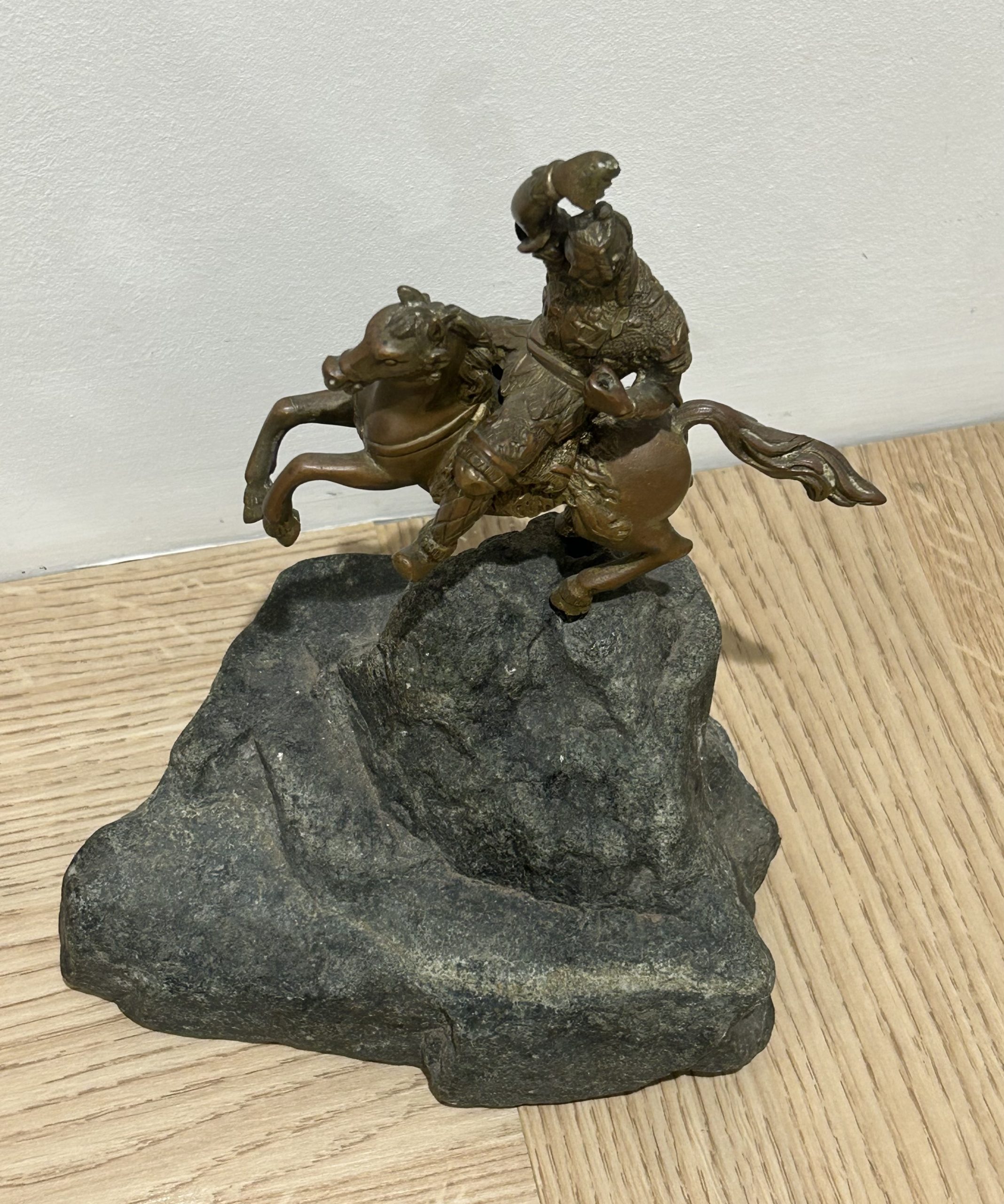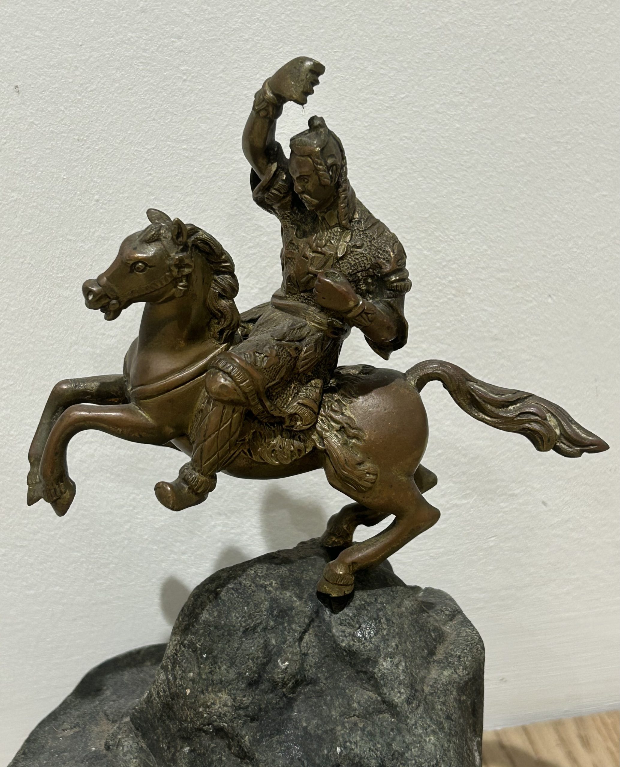 A superb early bronze of Genghis Khan on Horseback on a concrete base. Superb quality and condition measuring 18 x 10 and stands 25cm high.