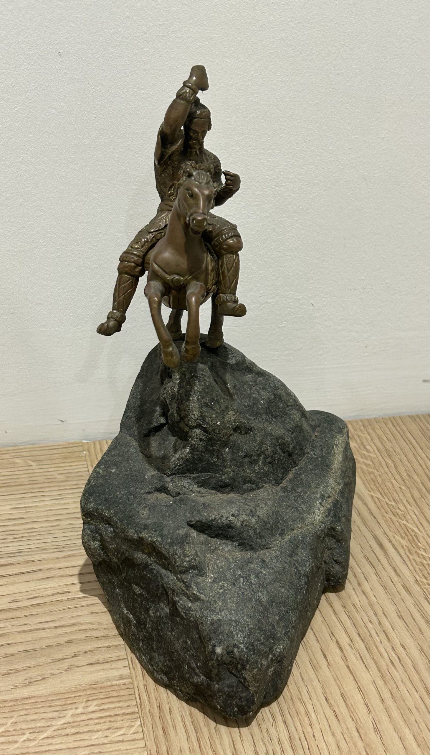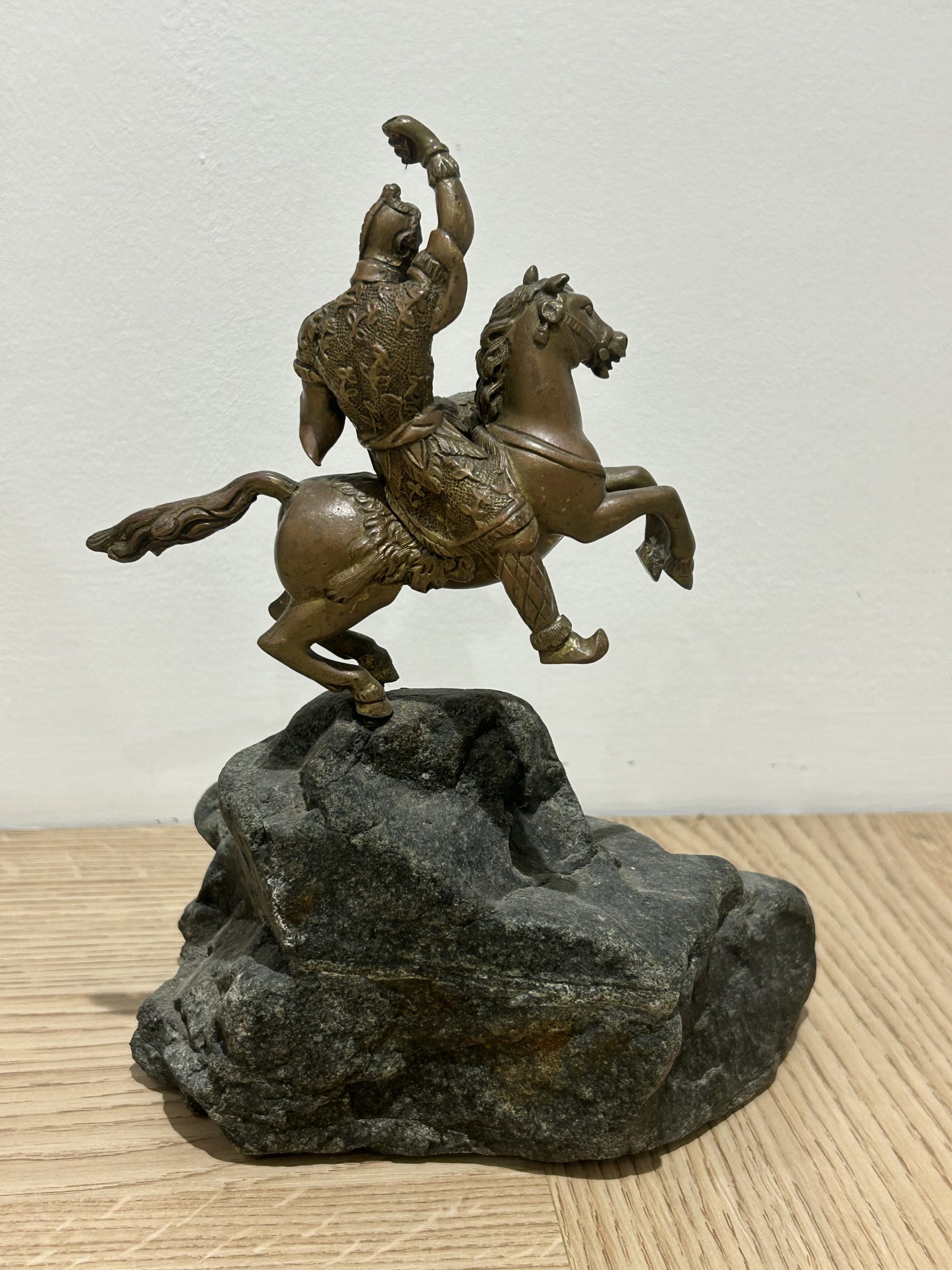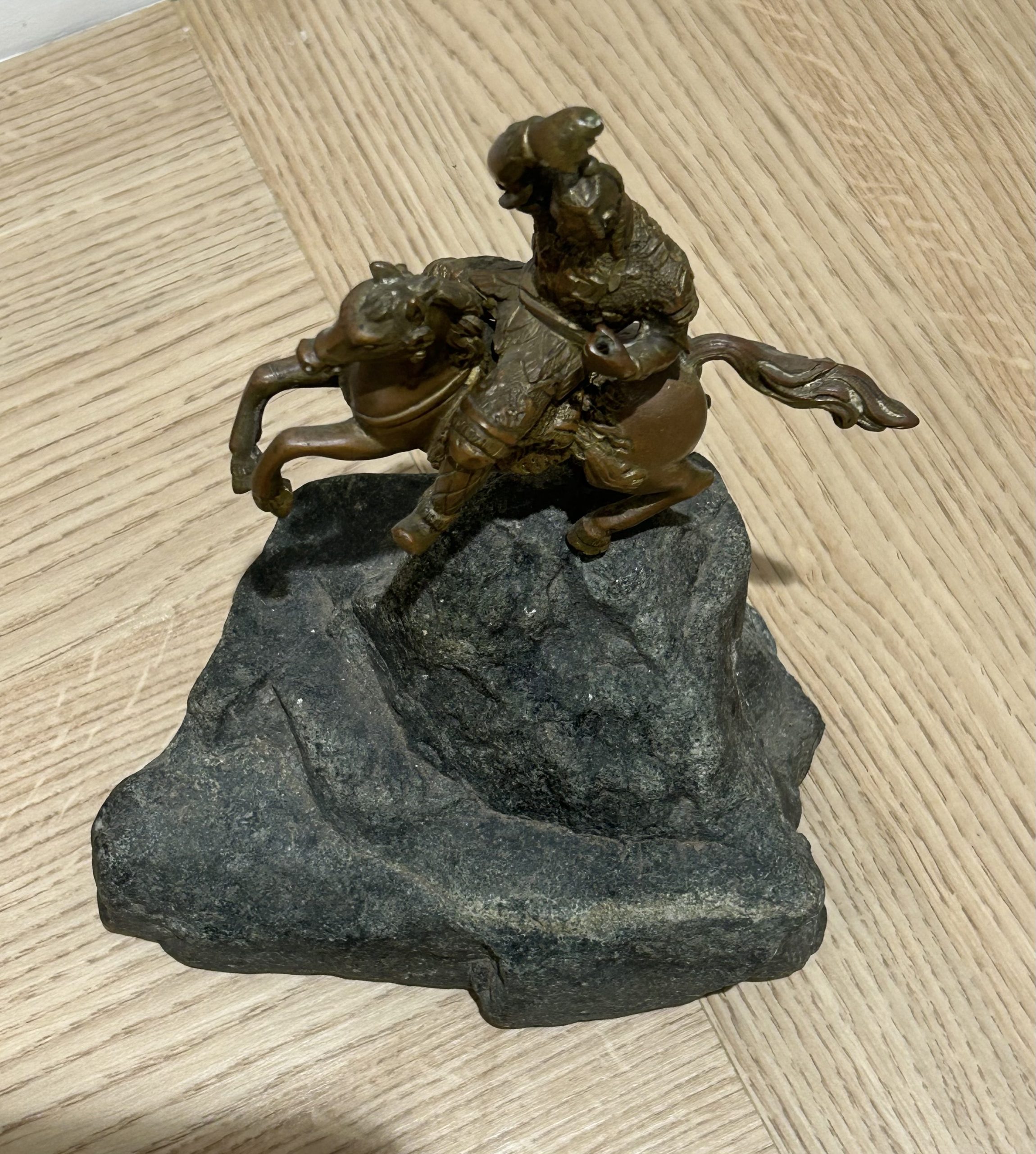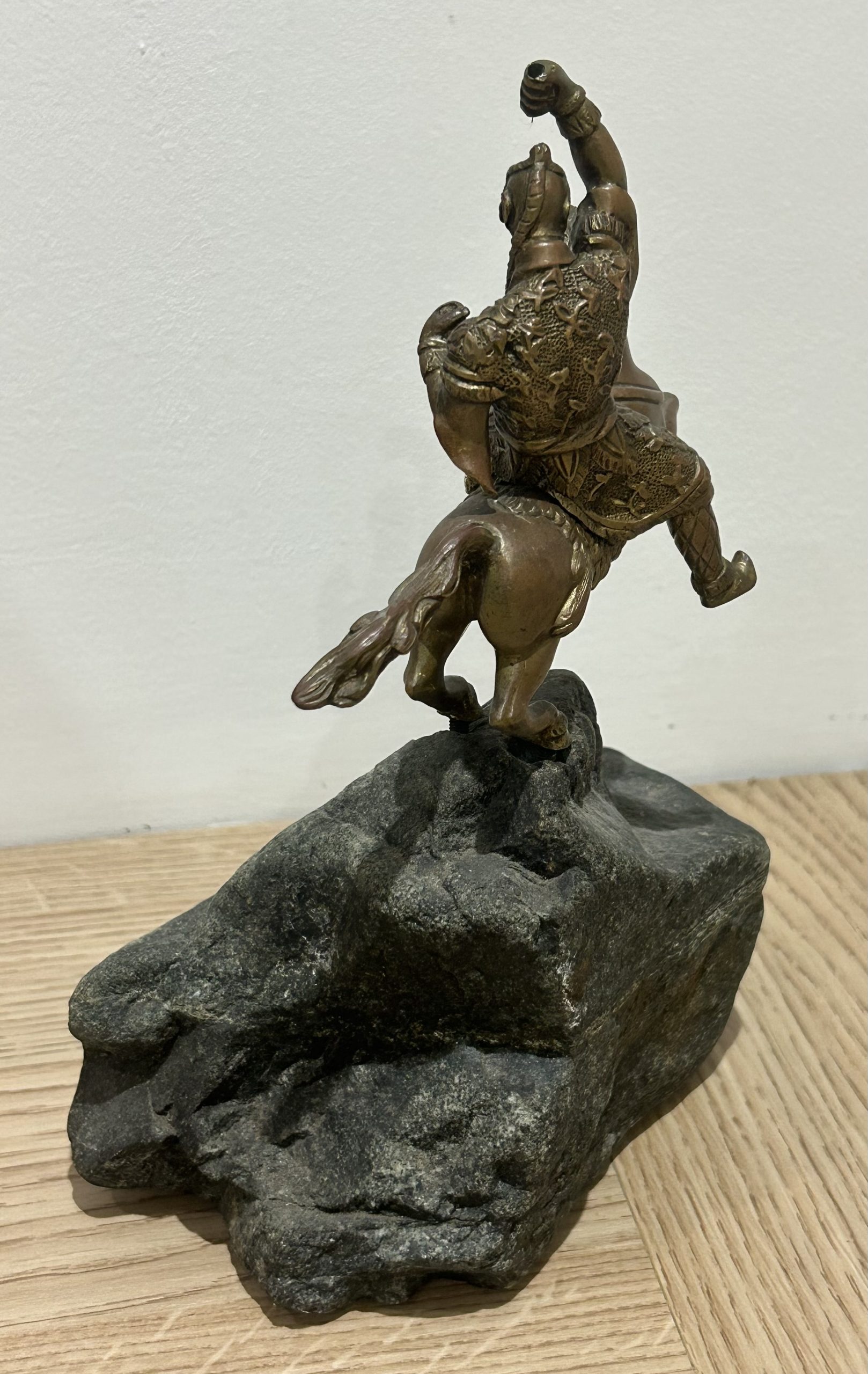 A superb early bronze of Genghis Khan on Horseback on a concrete base. Superb quality and condition measuring 18 x 10 and stands 25cm high.