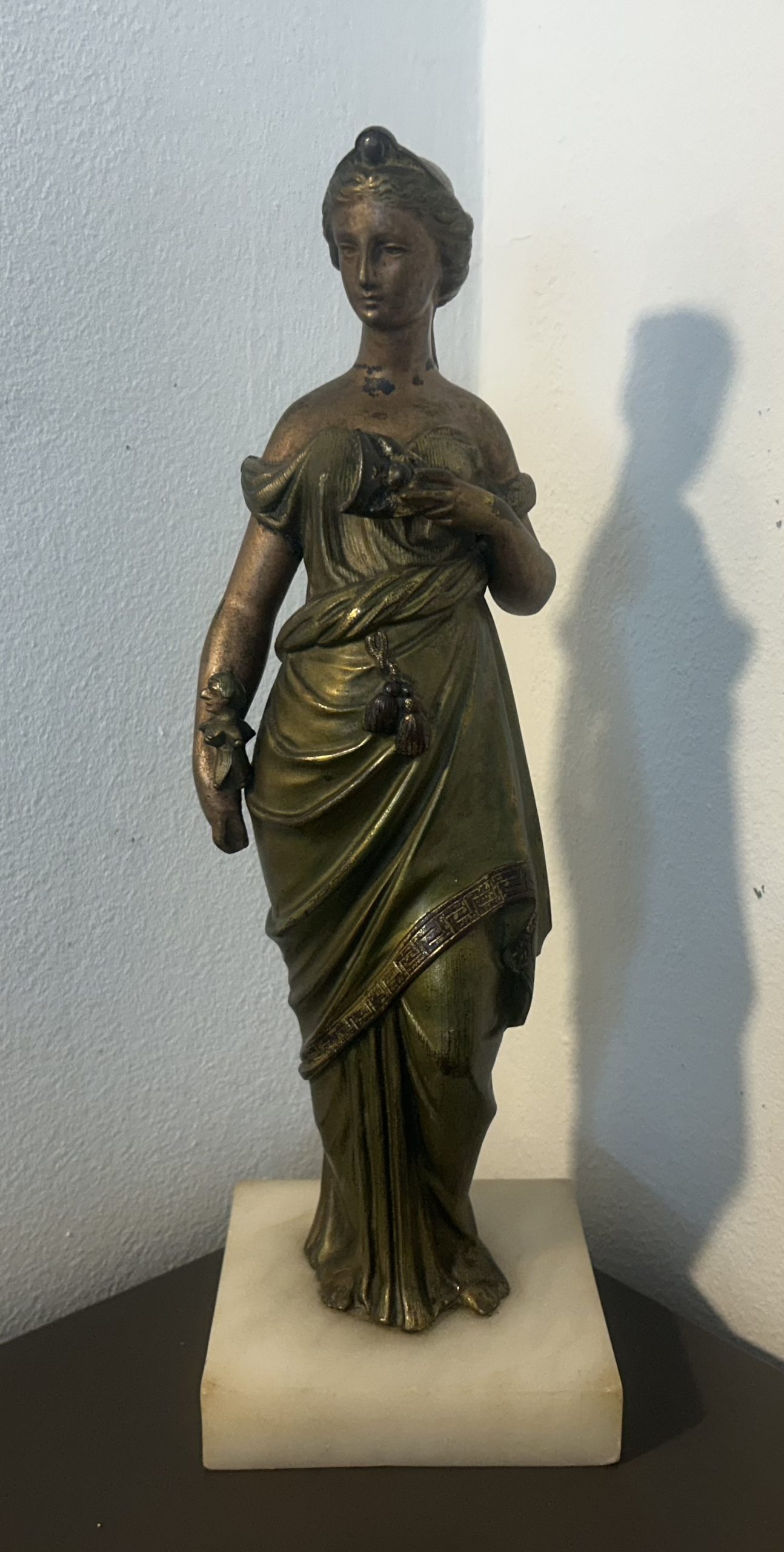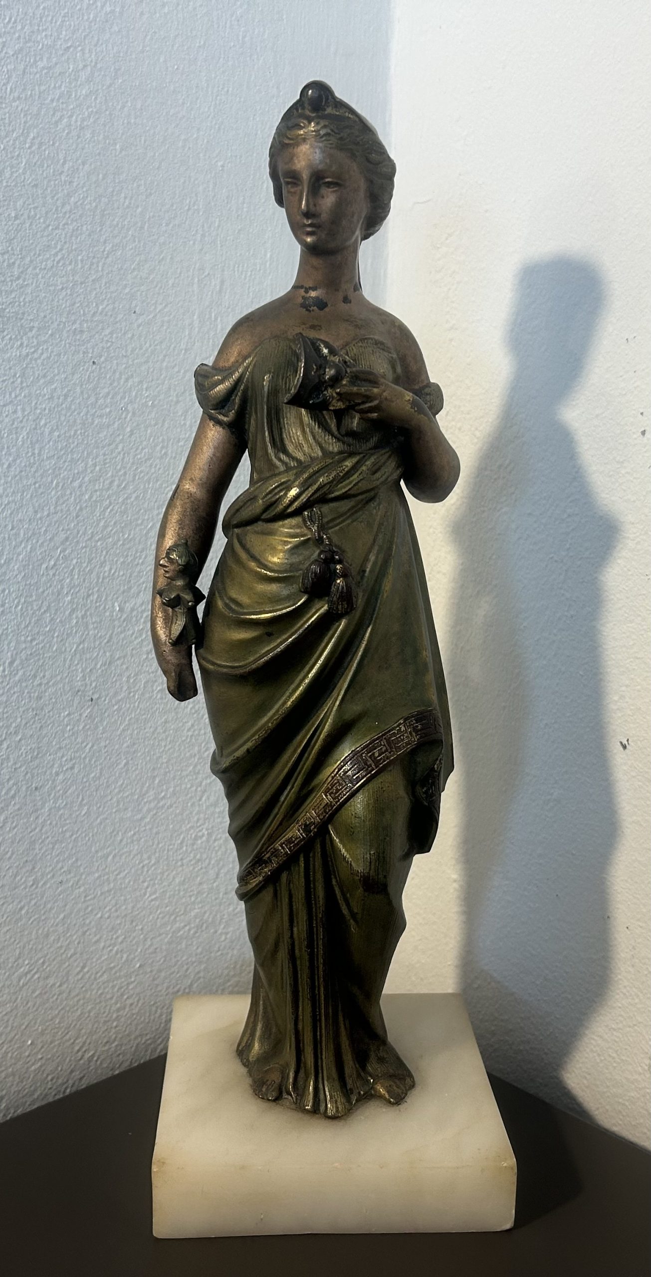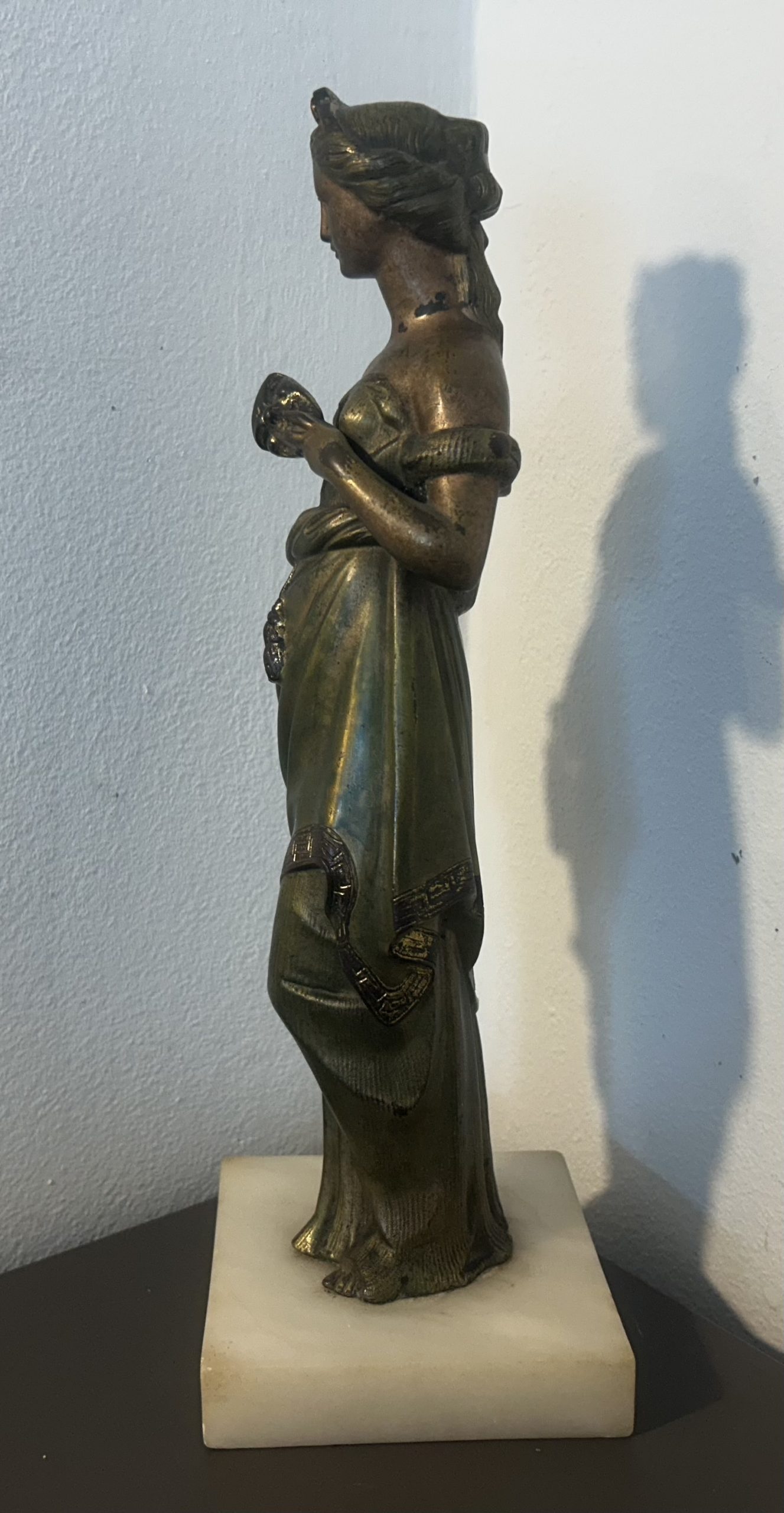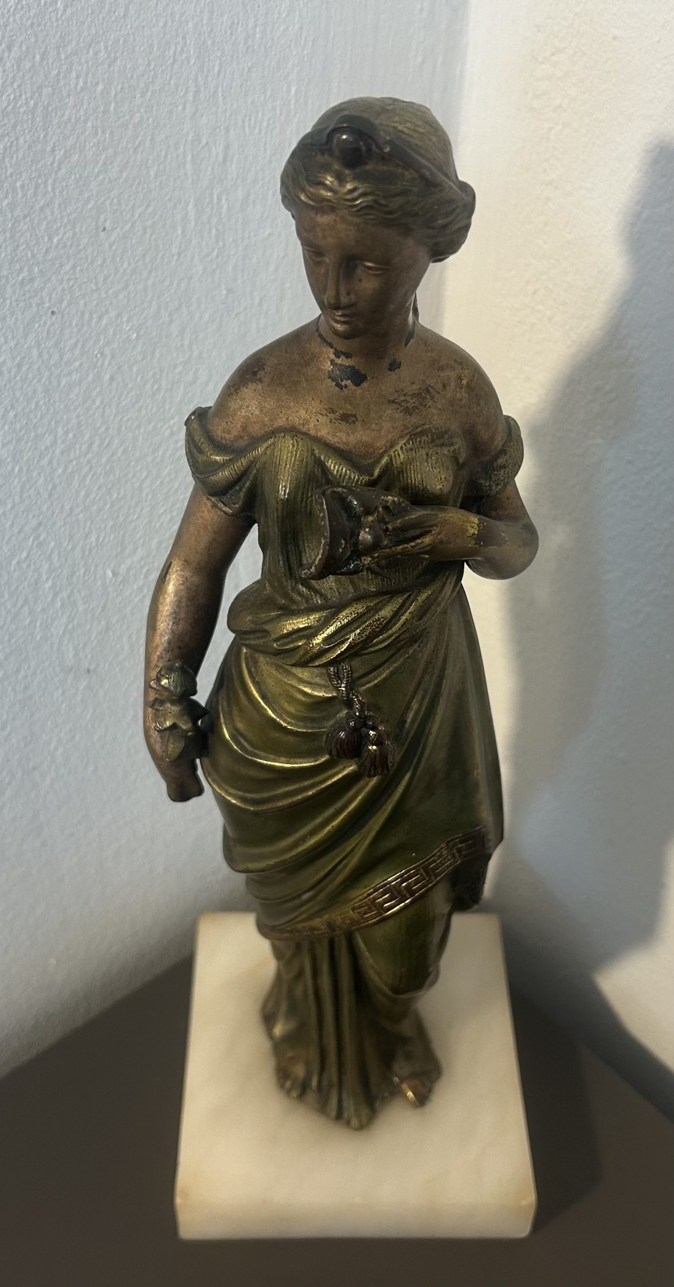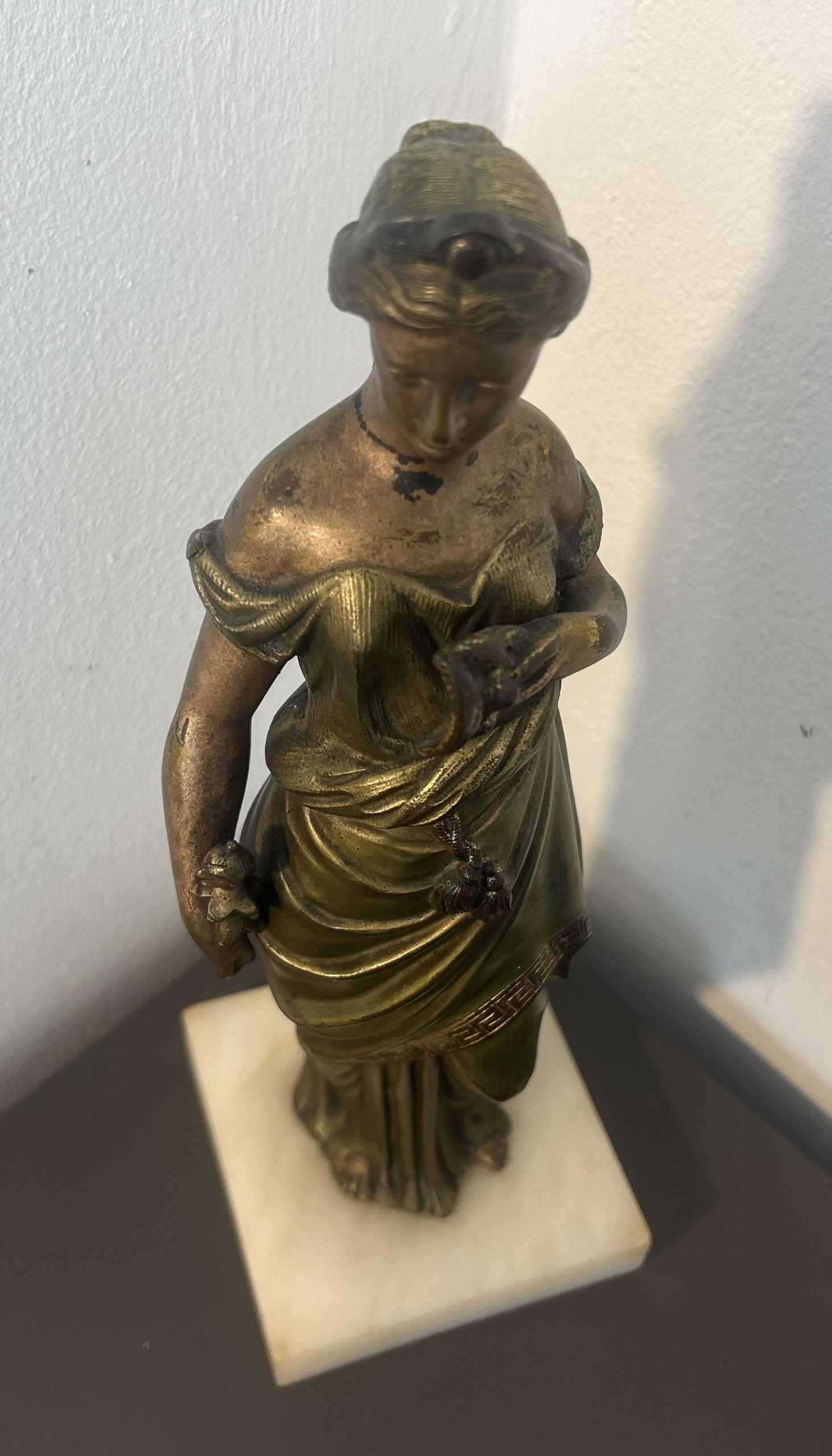 The piece is in wonderful condition with superb detailing sitting on a white marble base. She has a bronze toned effect.