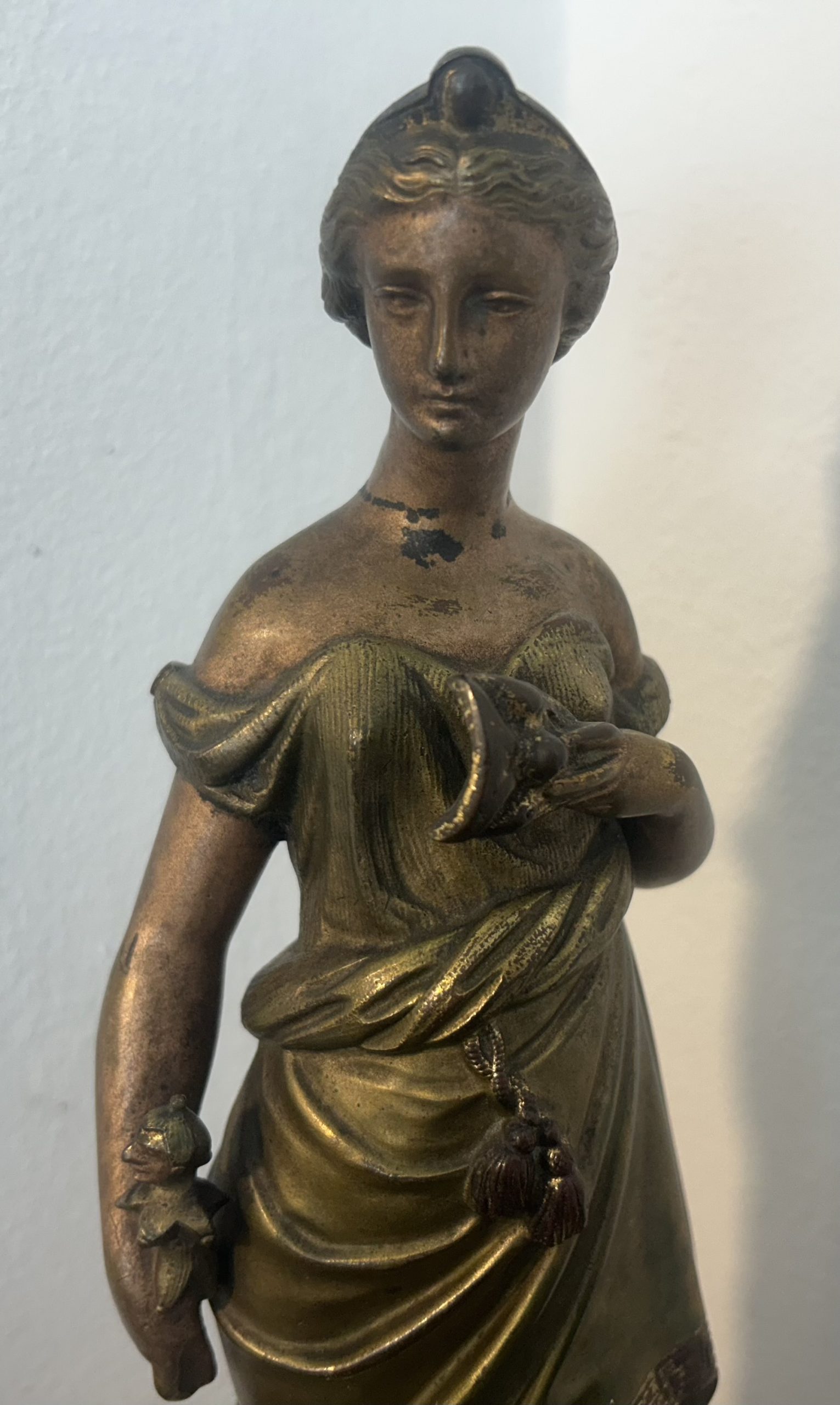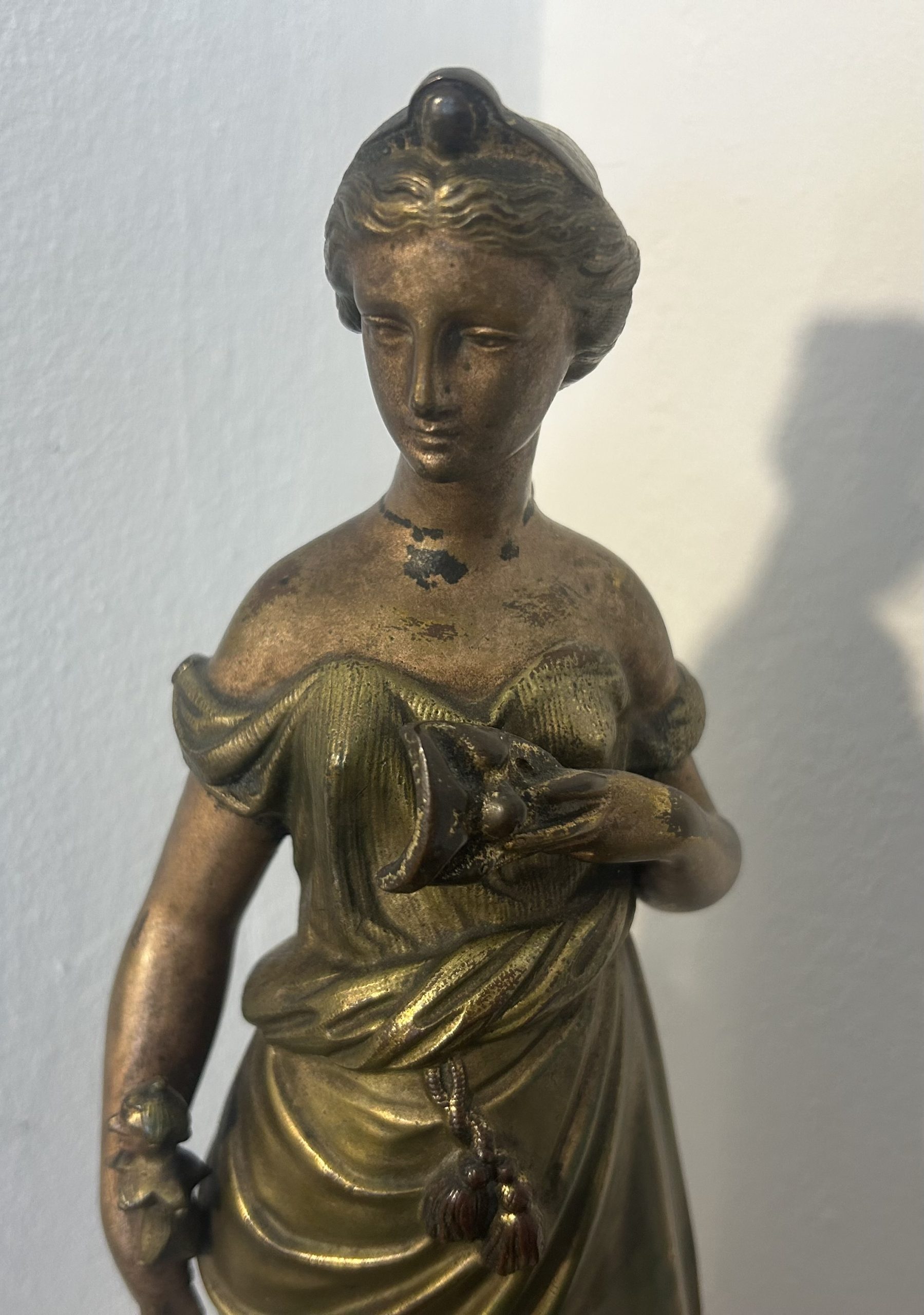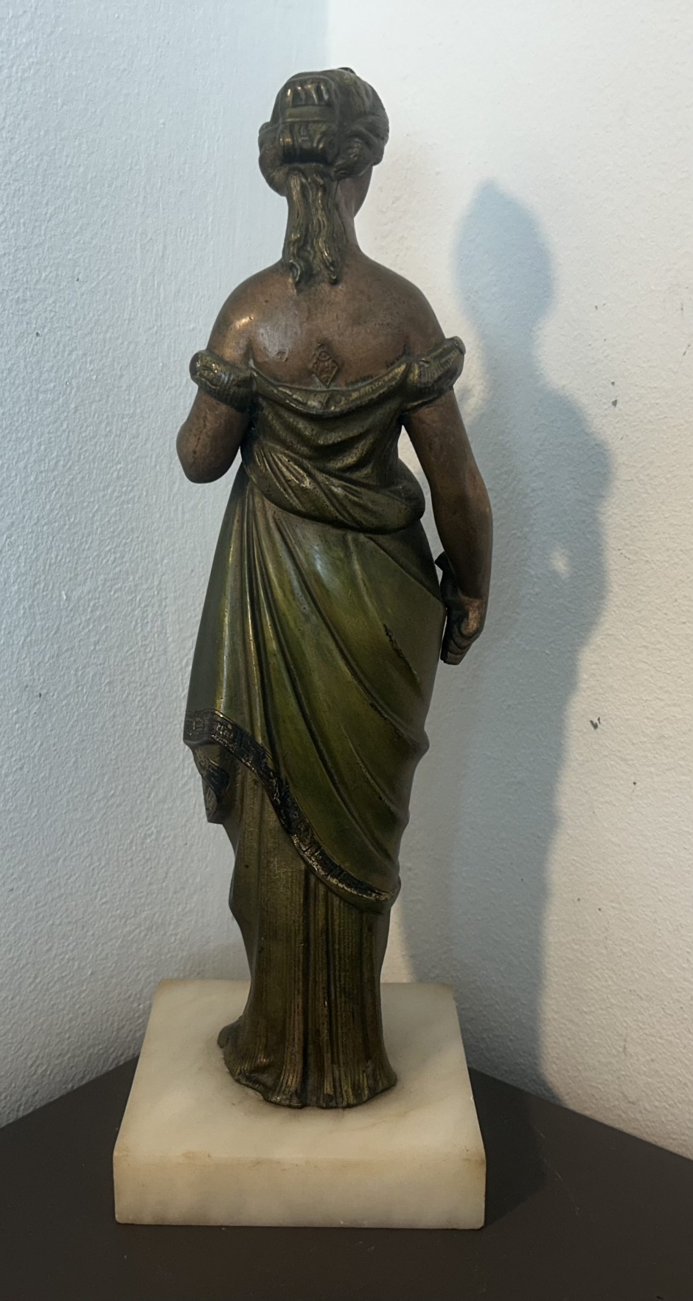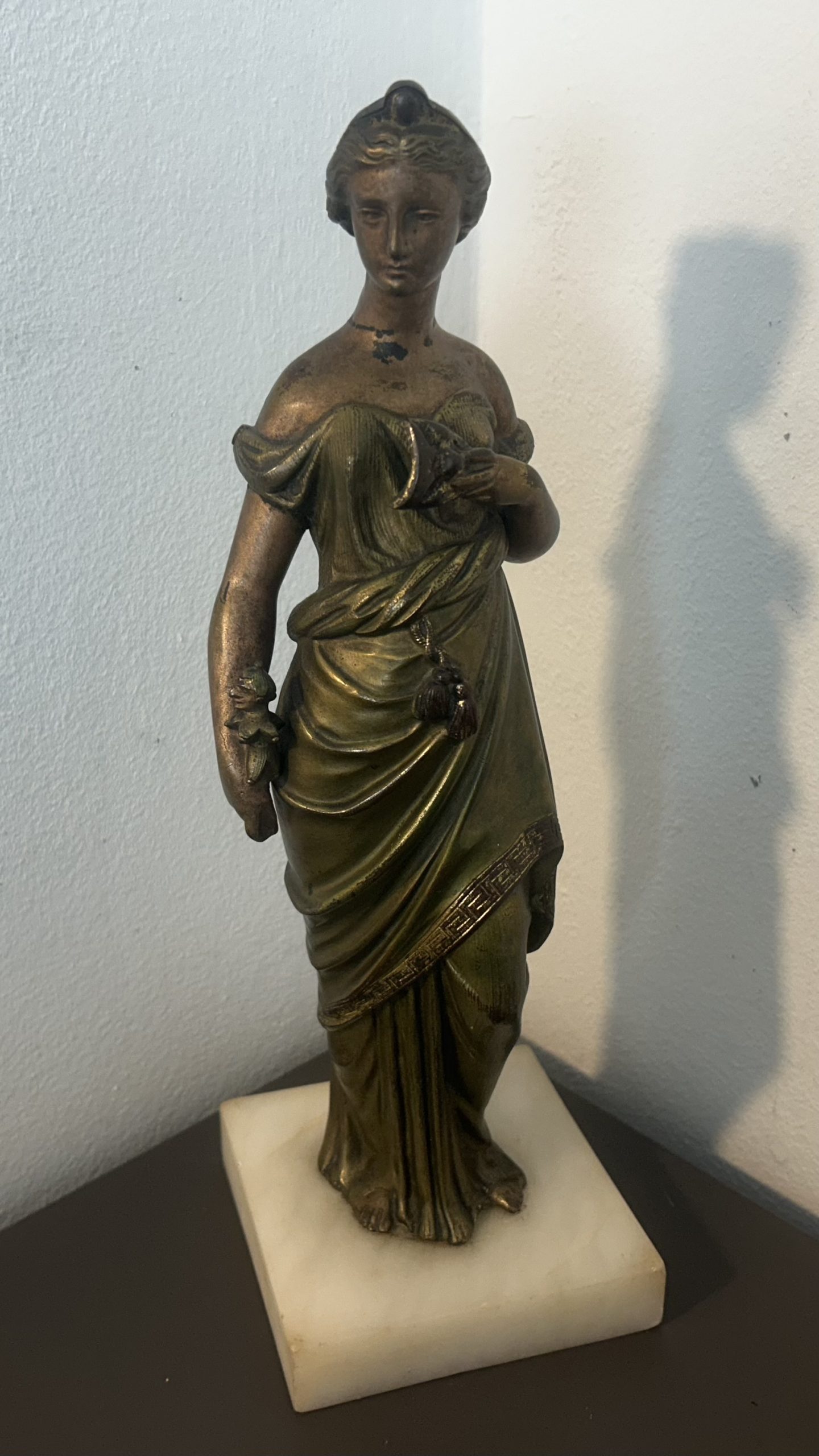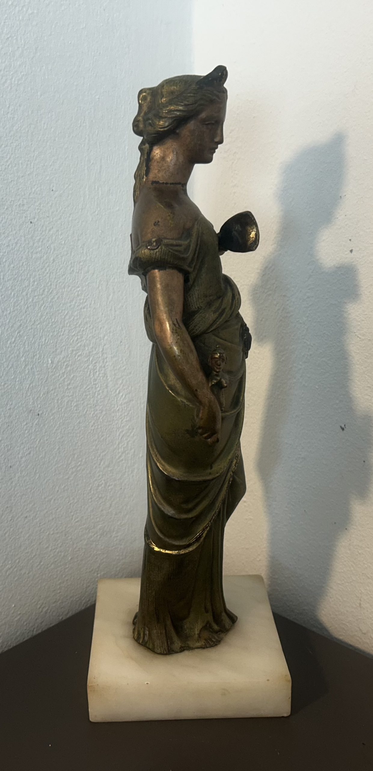 The piece is in wonderful condition with superb detailing sitting on a white marble base. She has a bronze toned effect.